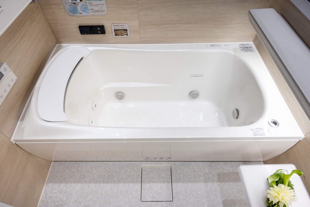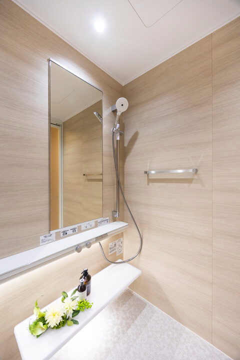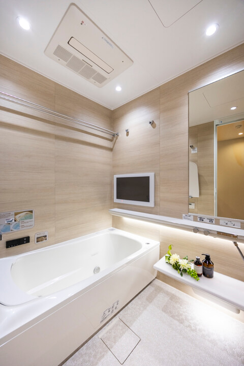 木目デザインが上質な空間を演出するバスルーム。冷えやすい肩まわりに大流量のお湯が流れる「肩楽湯」&ランダムな曲線で円を描くように噴出された水流が腰を中心に心地よい刺激を与える「腰楽湯」が、疲れた身体を癒してくれます。浴室換気乾燥暖房機&追い焚き機能も搭載されていて、1年中快適なバスタイムを過ごすことができます。