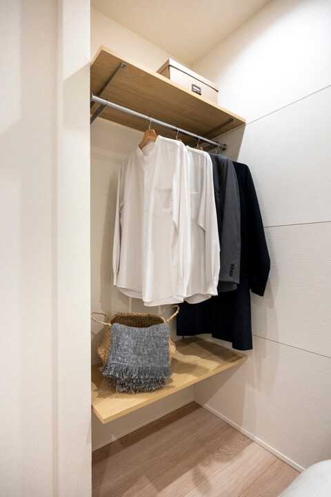 バルコニーに面する窓から明るい光が差し込む洋室2。オープンクローゼットを完備しています。扉がないので出し入れしやすく、見せる収納を楽しむことができますよ。通気性の良さも魅力的ですね。