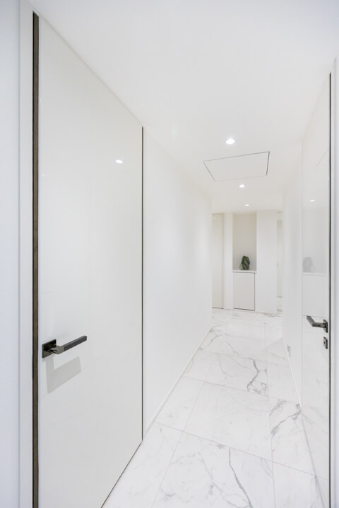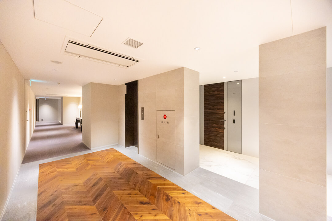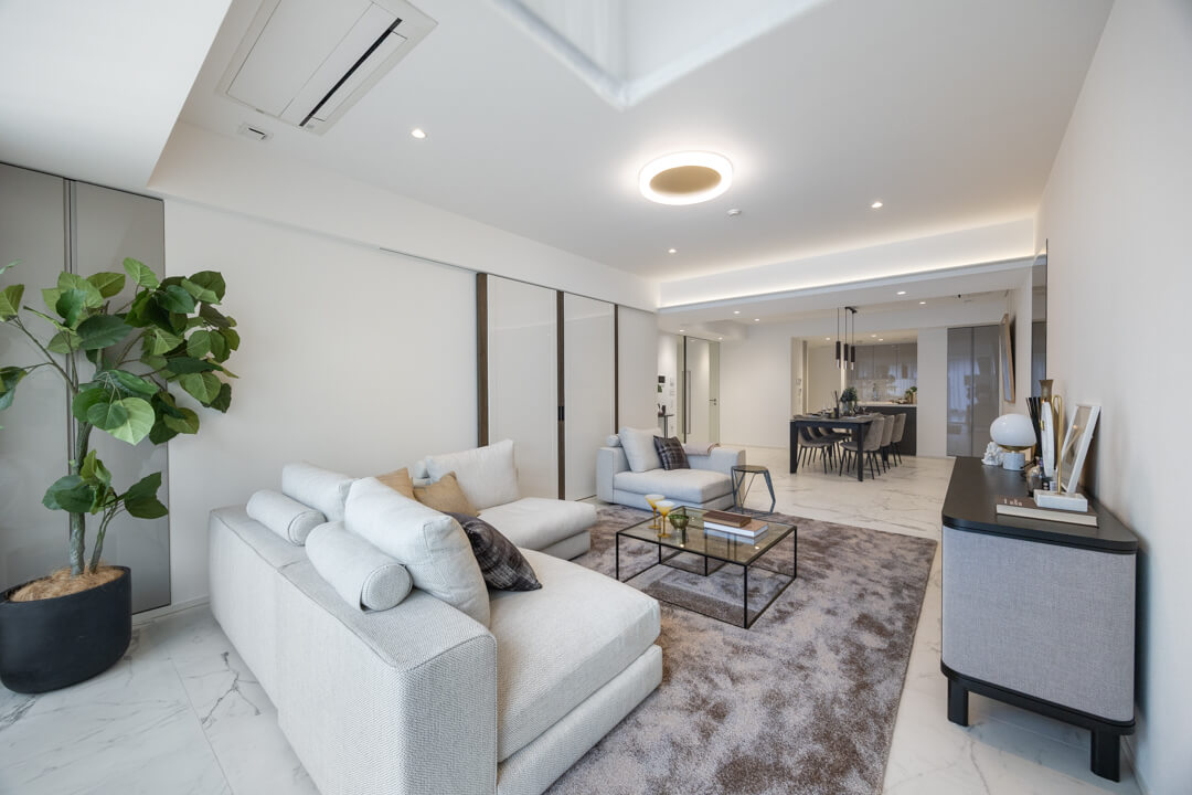 ホテルライクなタイル貼りの床。床暖房が設置されていて、冬場も足元からじんわりと温まれます。ビルトインエアコンも2基設けられていて、室内の温度調整もスムーズに行えます。