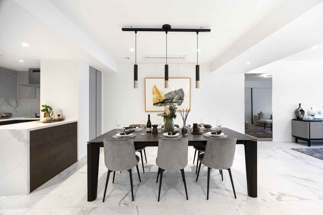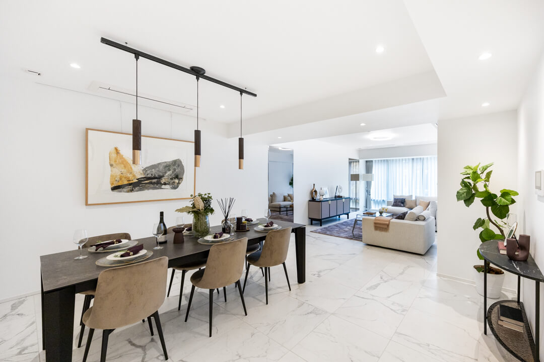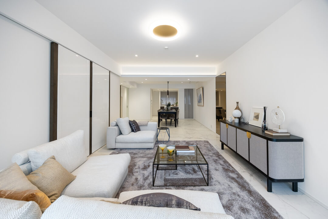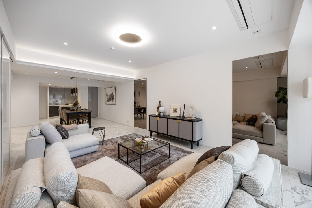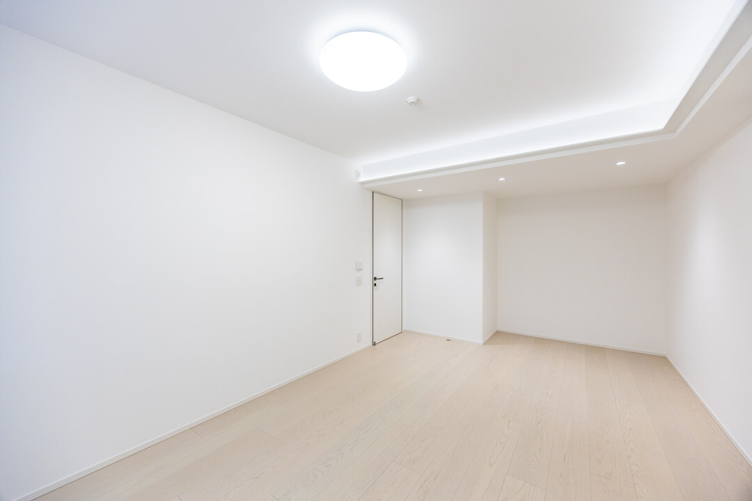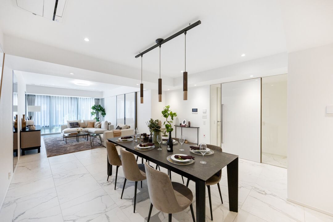 キッチンスペースを含め、約31.8帖のLDK。家族でゆったり過ごせ、ゲストも招けるゆとりある広さです。天井の一部には間接照明が施されていて、空間を優しく照らしてくれます。方角は南西向きで陽当たり良好。緑が感じられる心地よい景色が望めます。また、壁の一部にはピクチャーレールが設置されていて、キズつけずにアートや写真が飾れます。