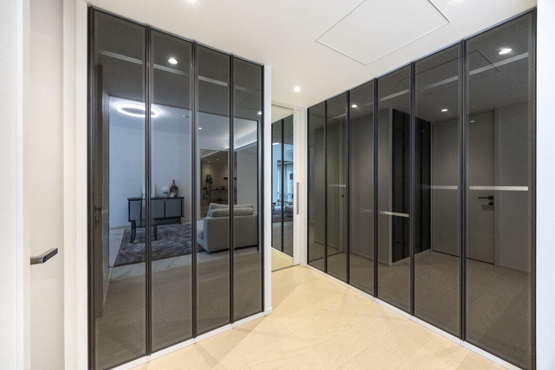 約10.8帖の主寝室。洋室は全て南西向きで自然光が感じられます。約3.8帖のWTC(ウォークスルークローゼット)付きで収納充実。クローゼットの扉が透明になっていて洋服が選びやすくなっているのもポイントです。リビングからも出入りできます。