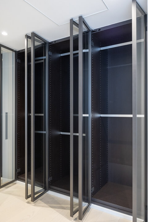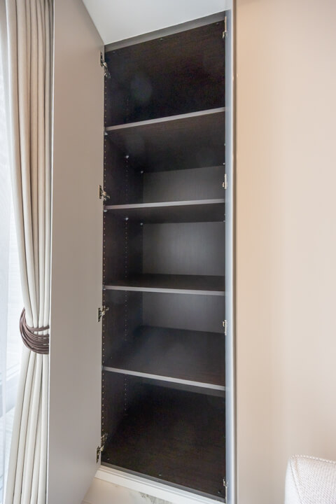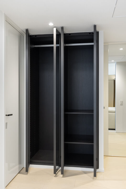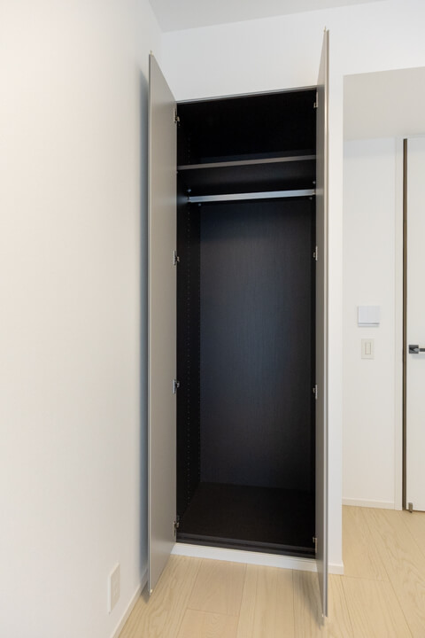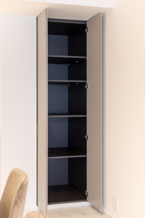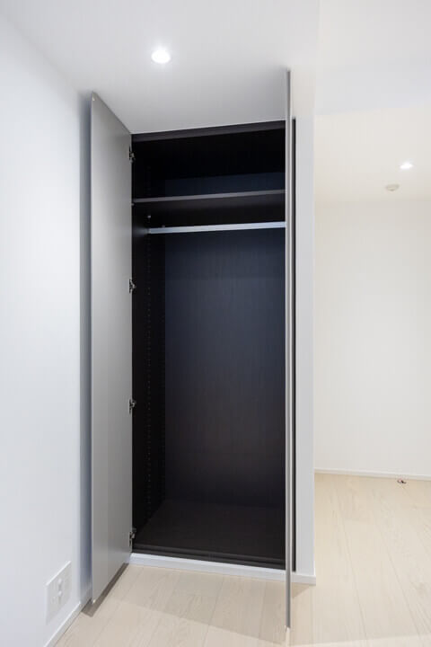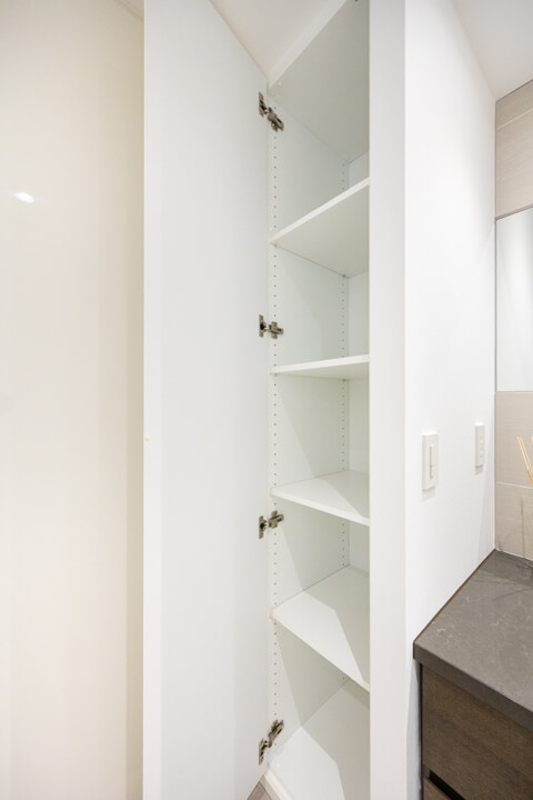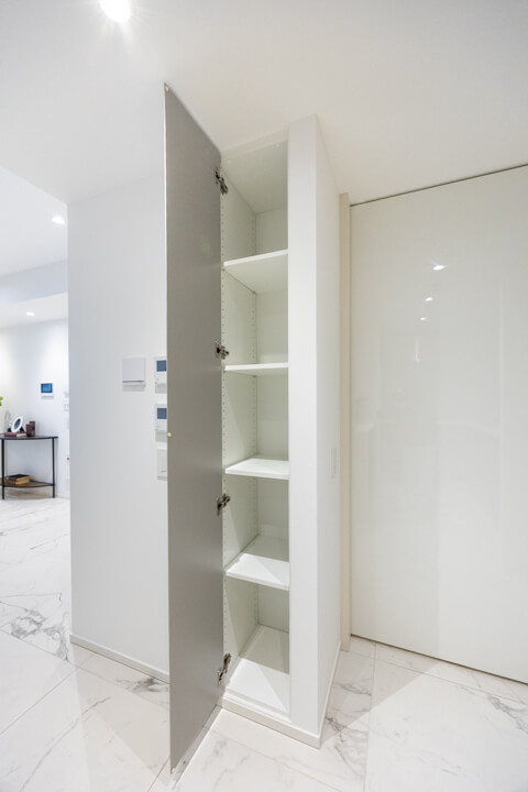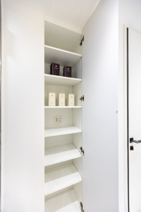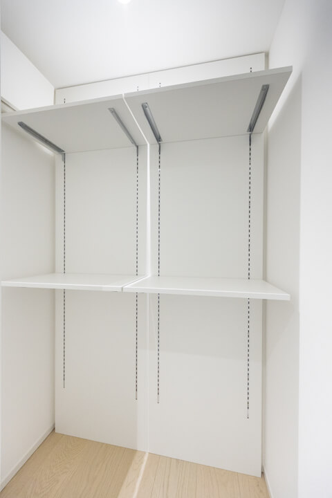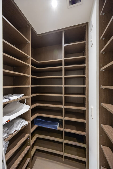 リビングダイニングの一角には物入が2つ備わっていて、生活雑貨の整頓に便利。また、WTC(ウォークスルークローゼット)も付いていてファミリークローゼットのように使えます。クローゼットは主寝室からも出入りできます。