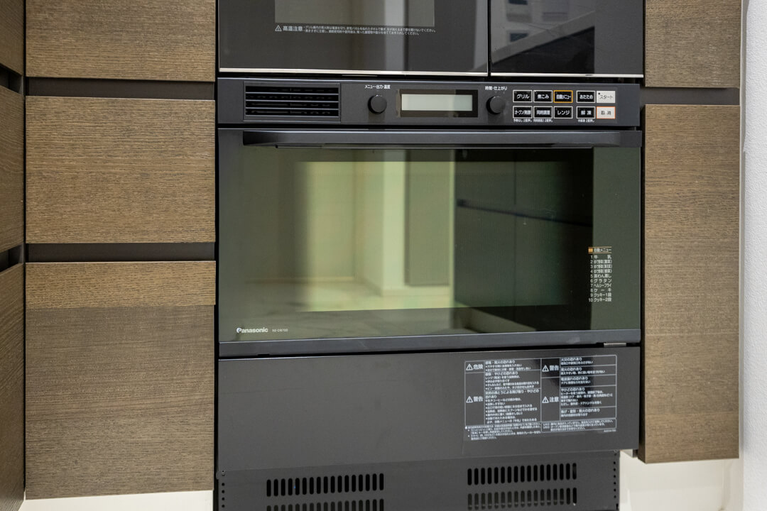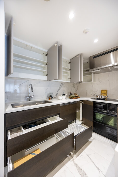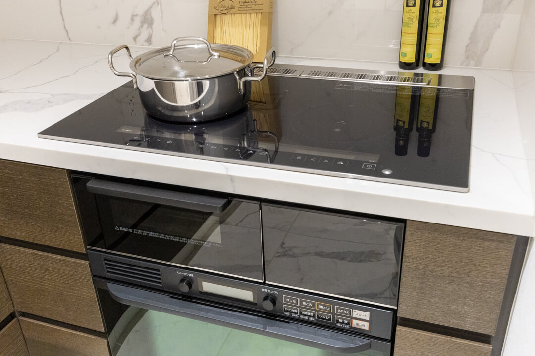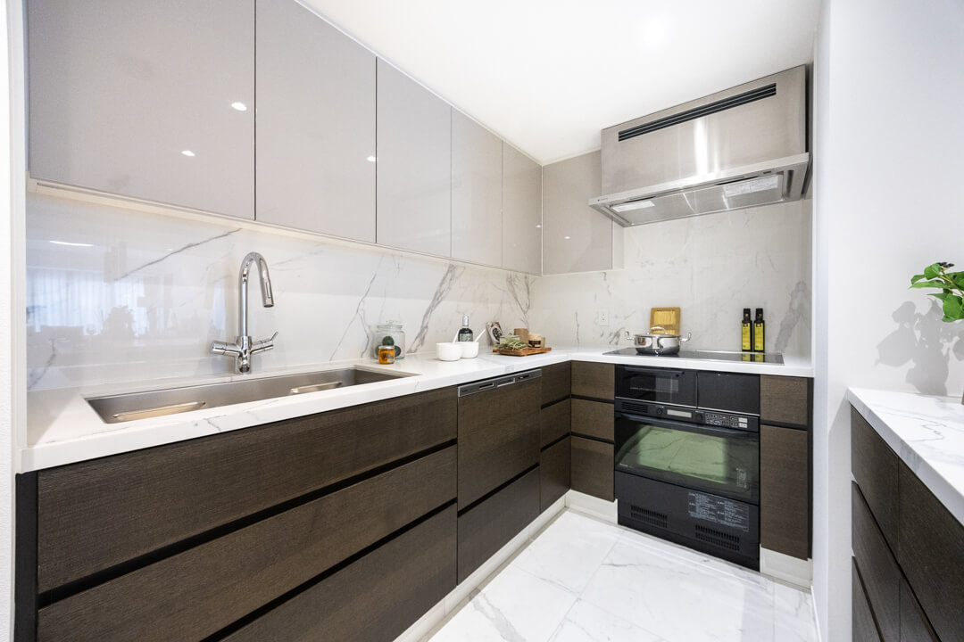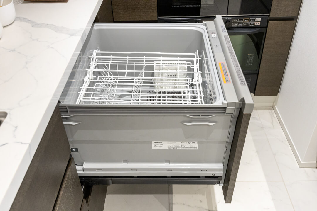 作業スペースが広々使えるL字型のシステムキッチン。生ごみの処理に便利なディスポーザー、家事の時短に心強い食洗機、手入れがしやすいIHクッキングヒーター、料理の幅が広がるビルトインコンベック付きで設備が充実しています。また、カウンター収納、物入付きで収納スペースも確保。キッチン横の扉はユーティリティスペースへ出入りできます。