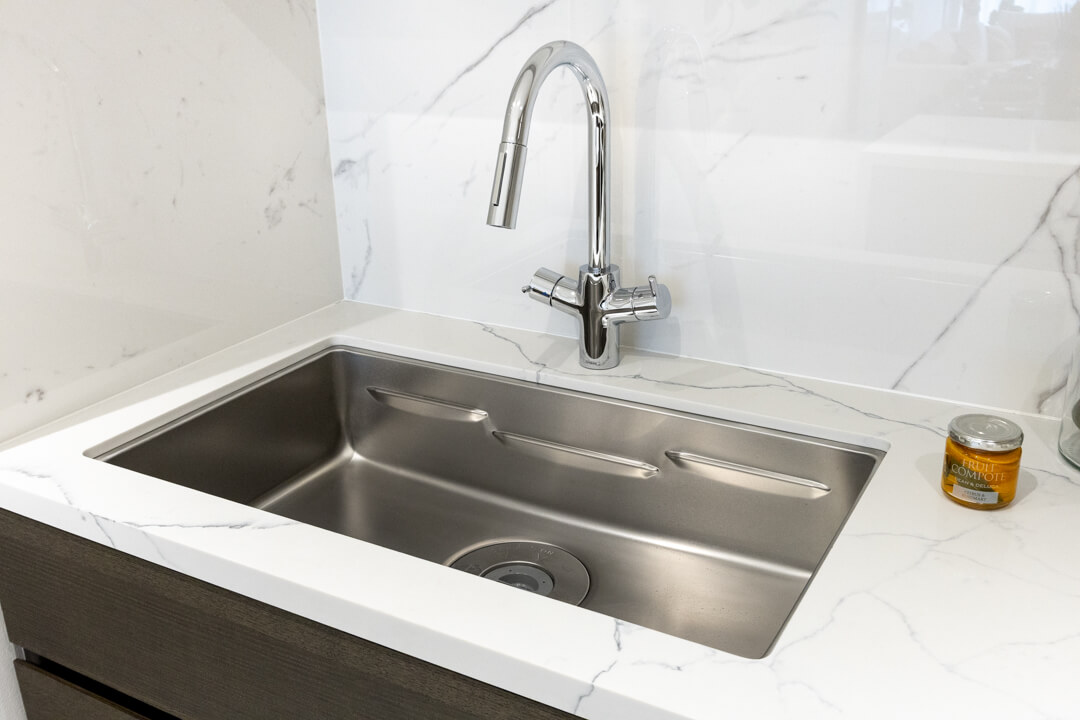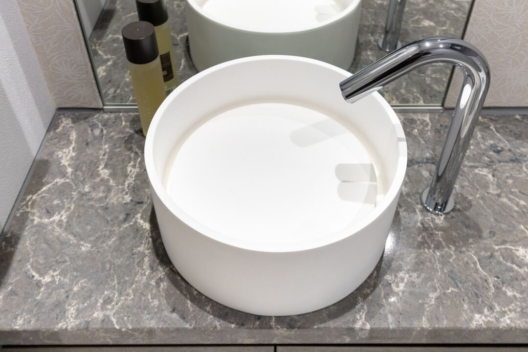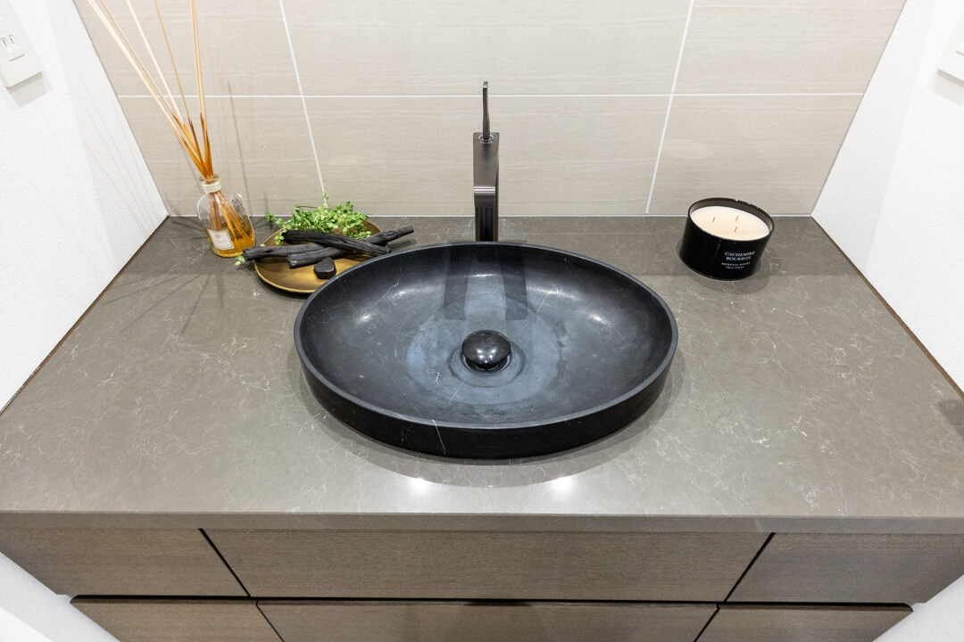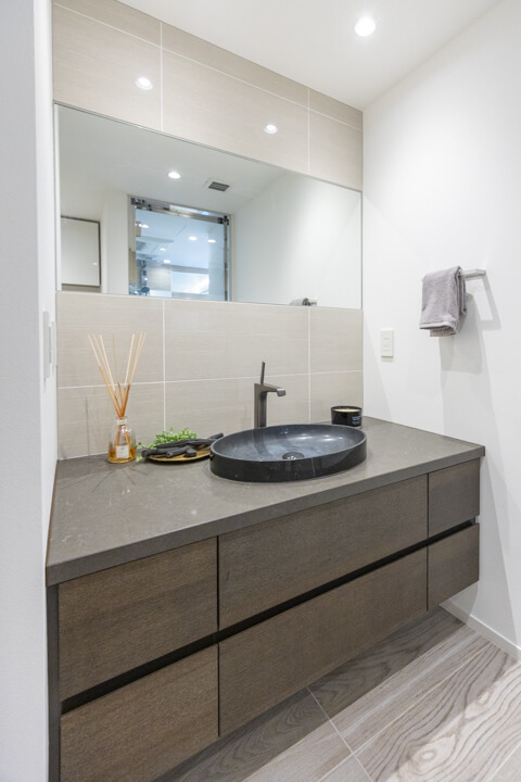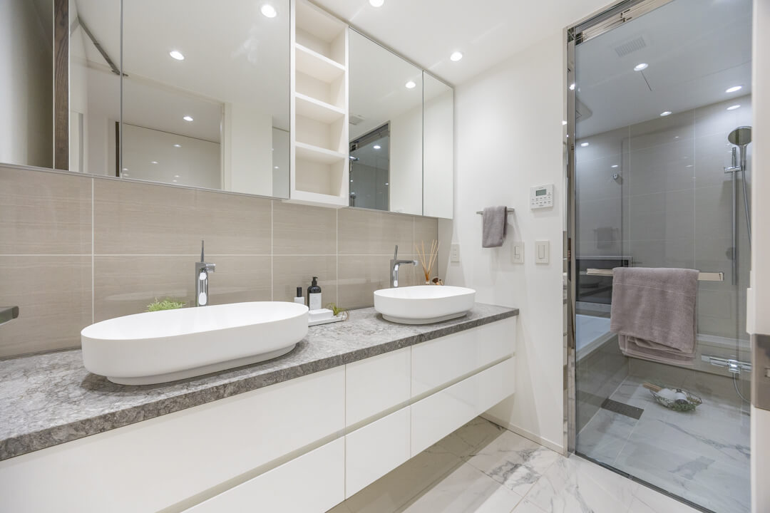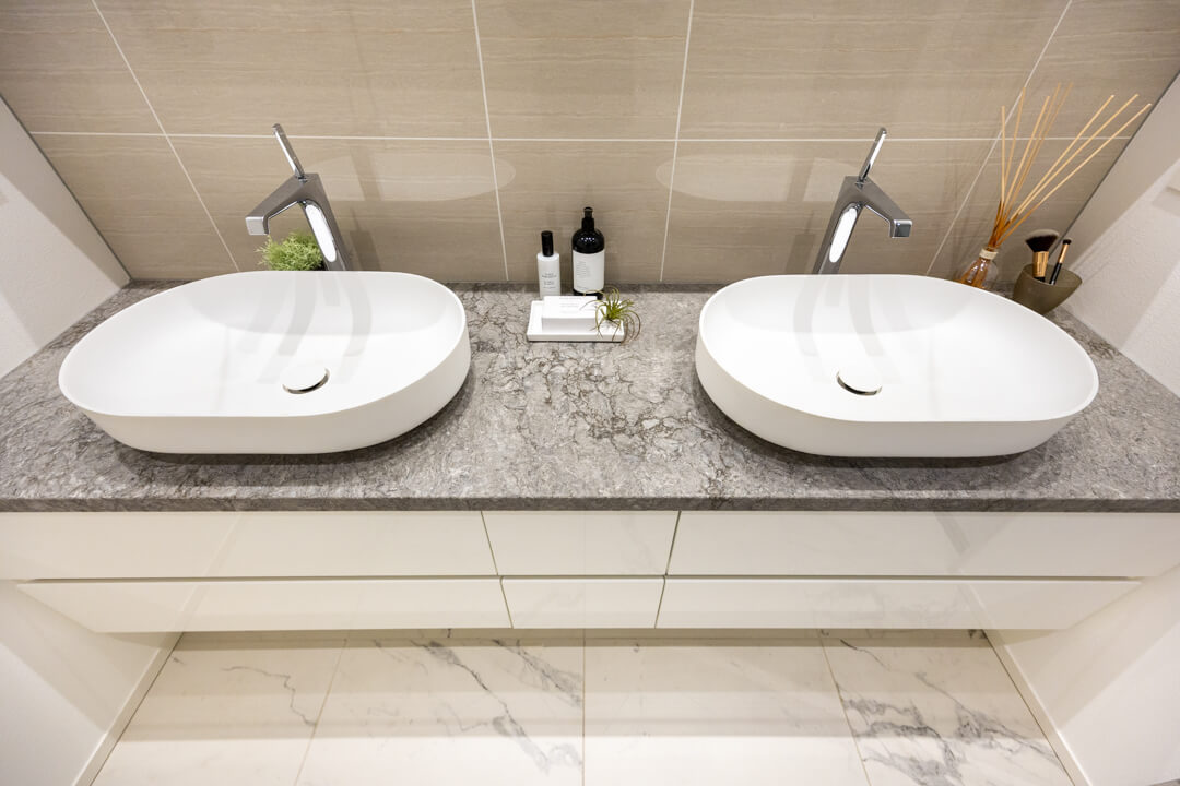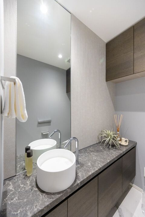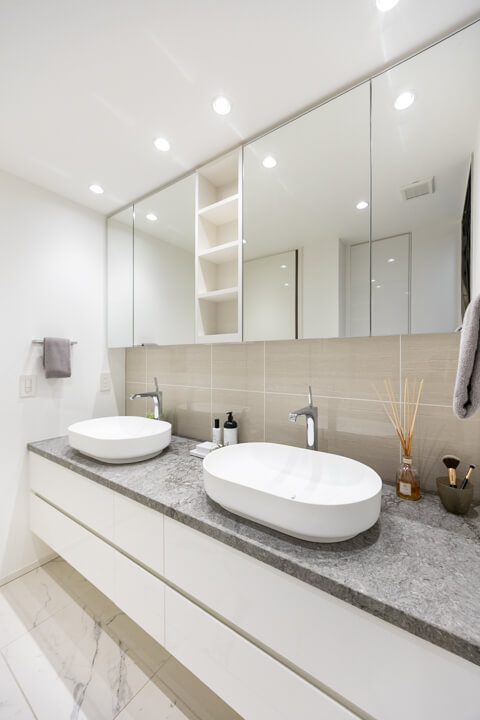 ホテルライクな2ボウルの洗面化粧台。家族で使用時間が重なってもそれぞれゆっくり使えます。洗面まわりの小物がすっきり整頓できるミラーボックスや、モノの出し入れがしやすい引き出し式のキャビネット付きで使い勝手の良さもポイント。別途、リネン庫も備わっています。