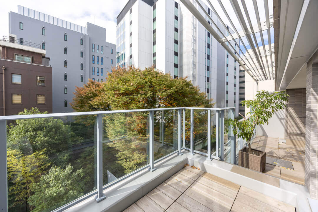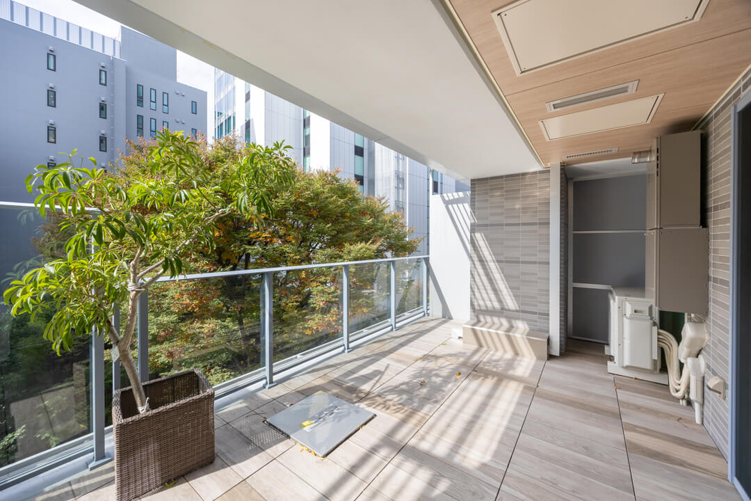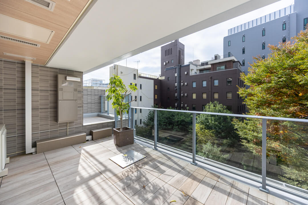 各洋室に面したルーフバルコニー。約24.70㎡のゆとりある広さです。ウッドパネルが敷かれていて見た目の印象も◎。イスやテーブル、観葉植物などが置けます。手すりは透明で開放的。景色を遮らず心地よい緑が望めます。