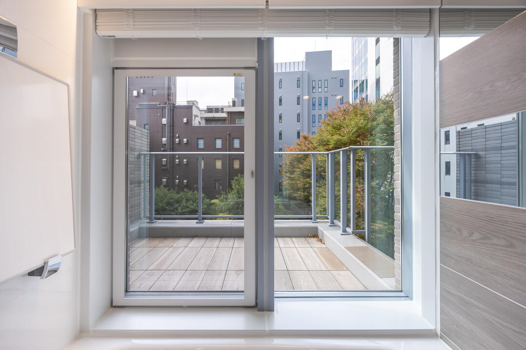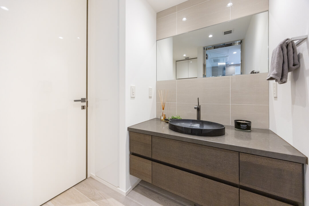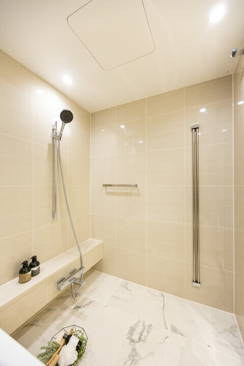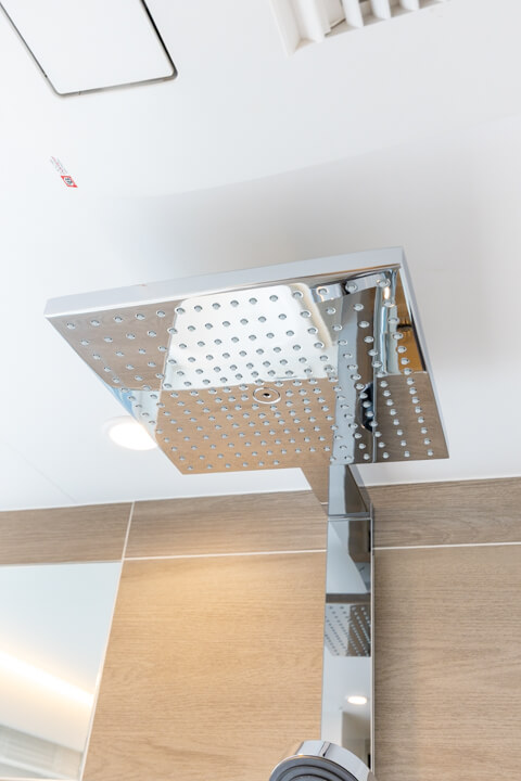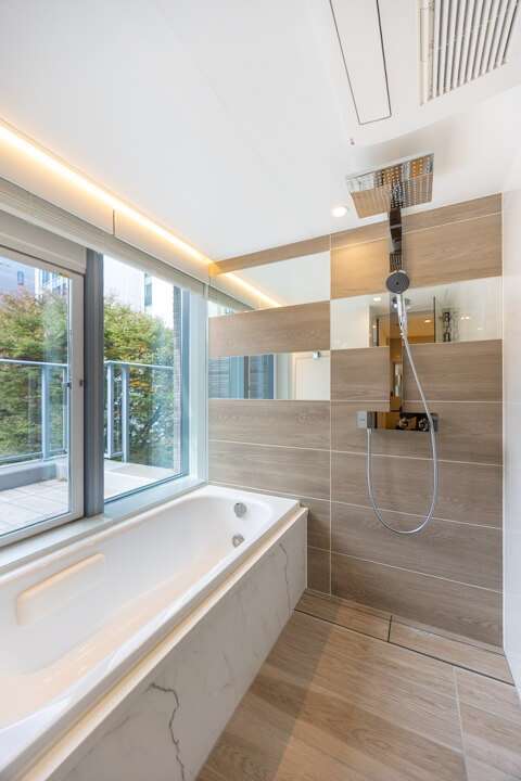 WTC(ウォークスルークローゼット)の奥には洗面室・トイレ・浴室を完備。浴室は自然な光が入る窓付きで、開放感がたっぷりと感じられます。窓はルーフバルコニーに面しています。また、オーバーヘッドシャワー付きで贅沢なシャワータイムが楽しめます。