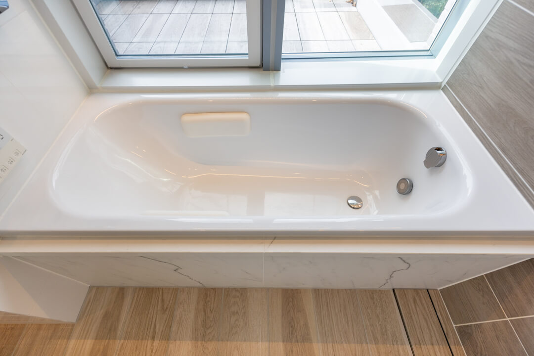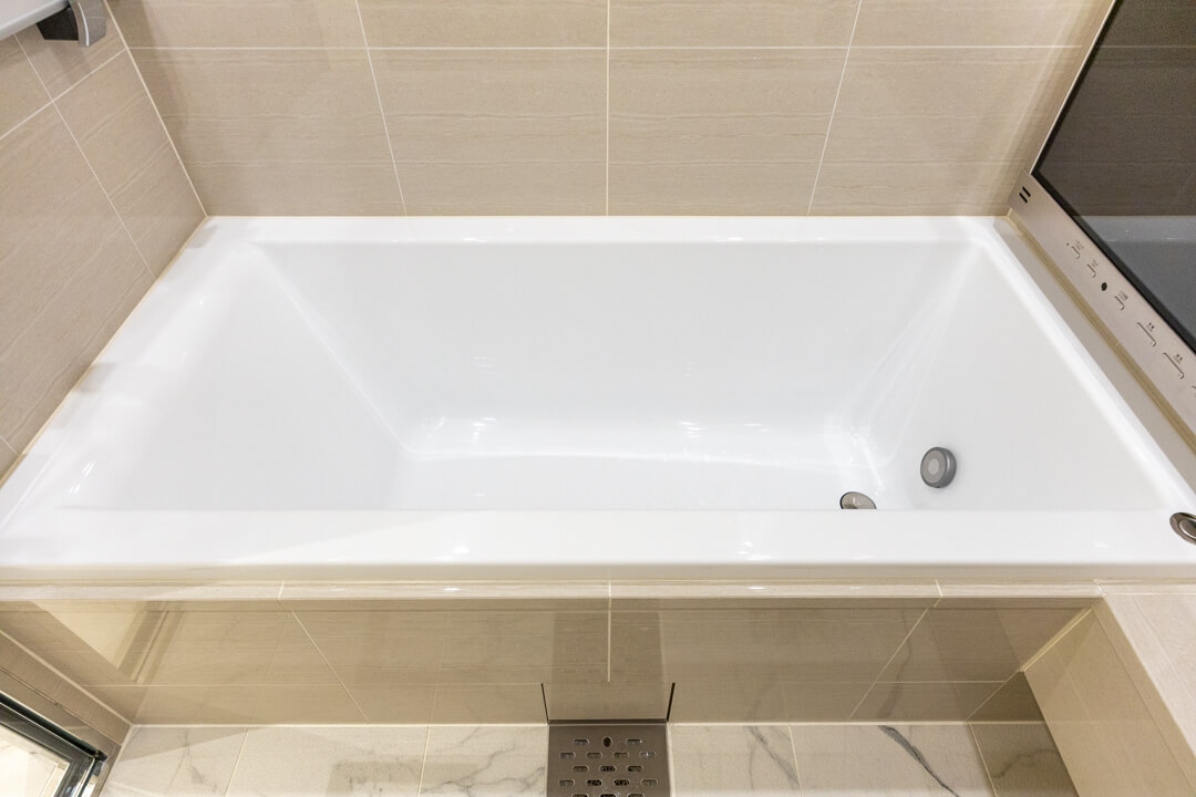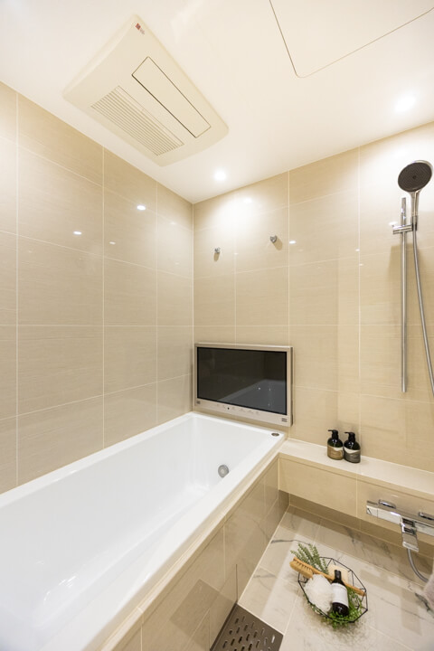 1620サイズのゆとりある広さのバスルーム。タイル貼りで上質な雰囲気が感じられます。追い炊き機能の他、乾燥・換気・暖房・換気の機能が備わっていて、一年中快適にバスタイムが楽しめます。また、浴室TV付きでより充実した入浴時間を過ごせます。