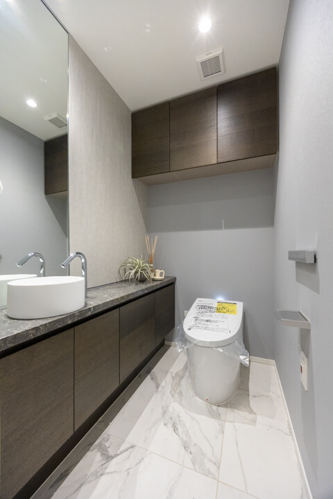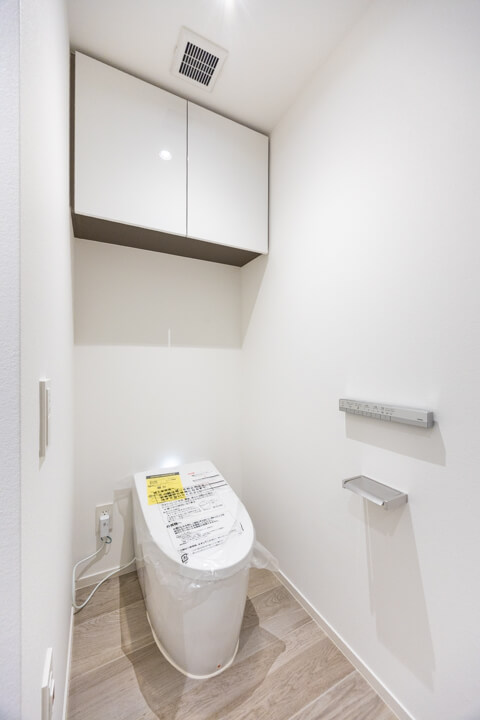 廊下に面した独立性のレストルーム。空間がすっきり見えるタンクレストイレです。手洗いカウンター、ウォシュレット、収納スペースも付いています。