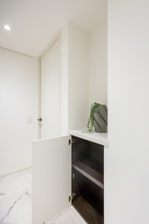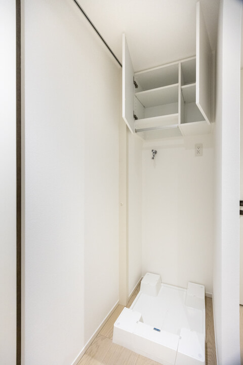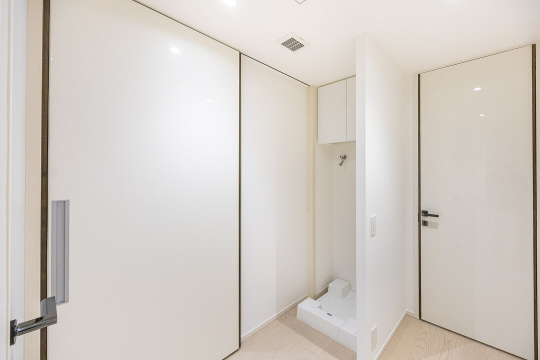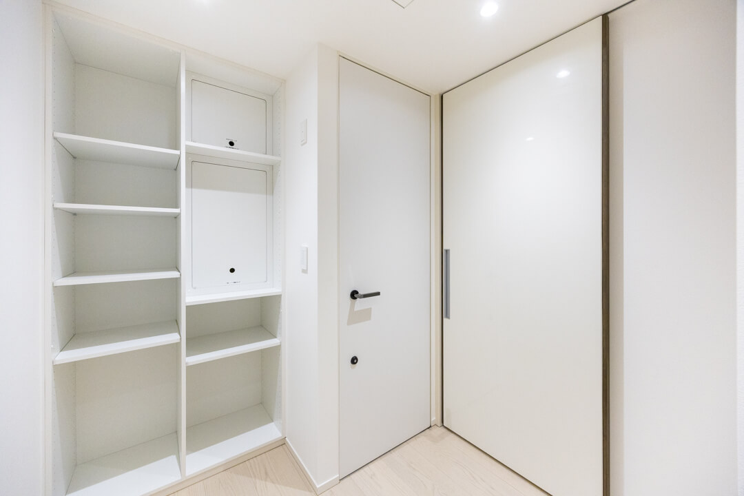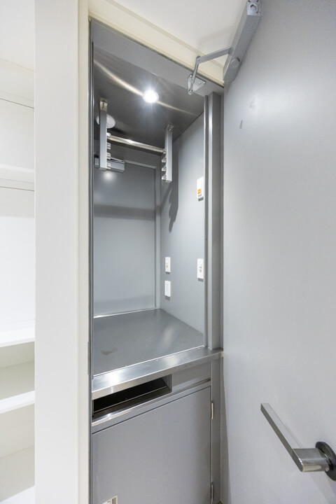 洗面室とは別にユーティリティスペースを完備。洗濯機置き場、可動棚が設置されています。さらにゴミ出し、宅配便の受け取り、クリーニング等を受け取れるバトラーボックスも設置されています。