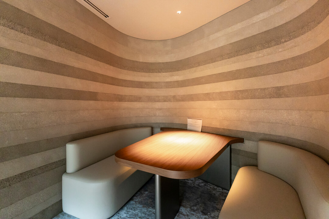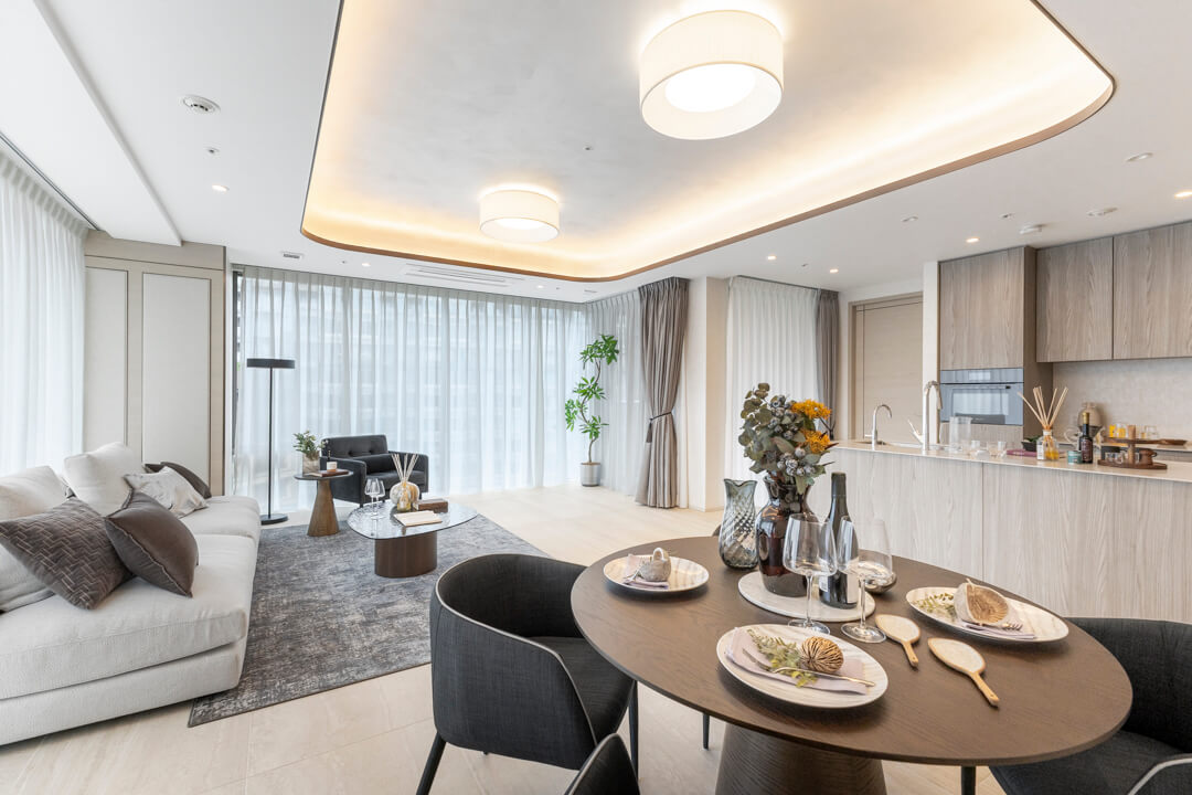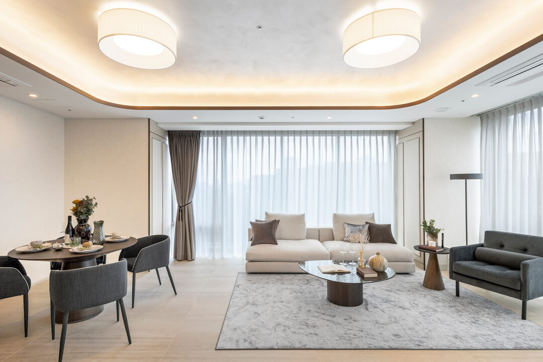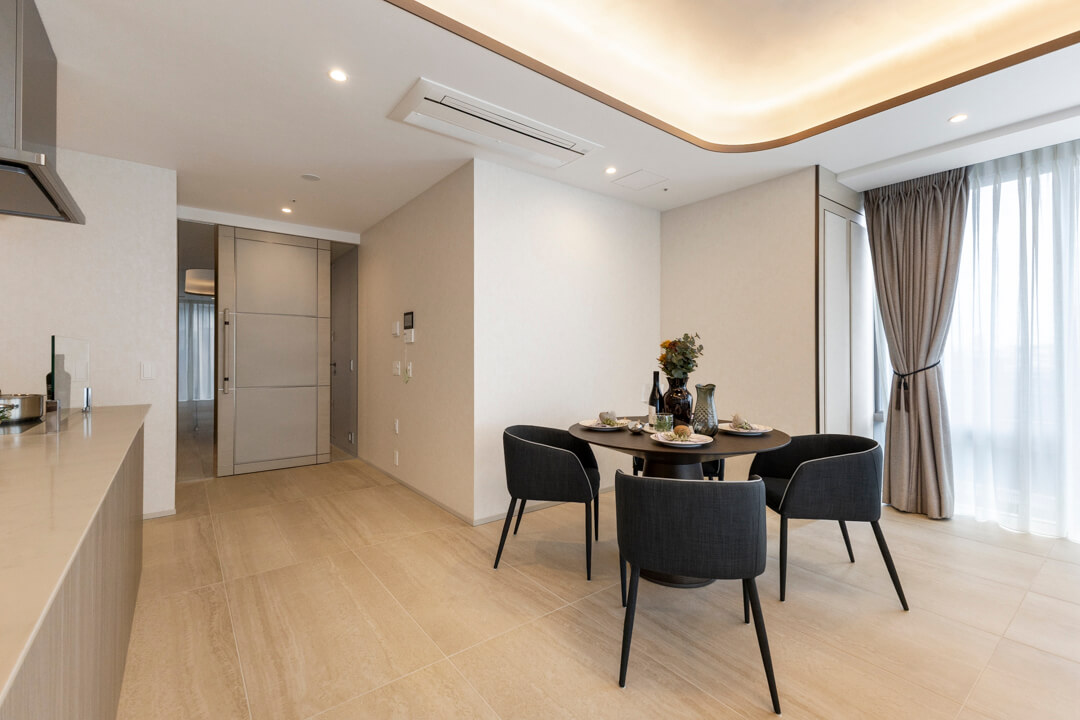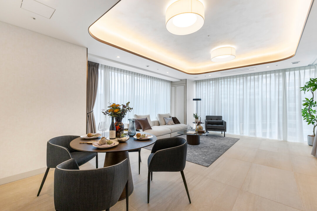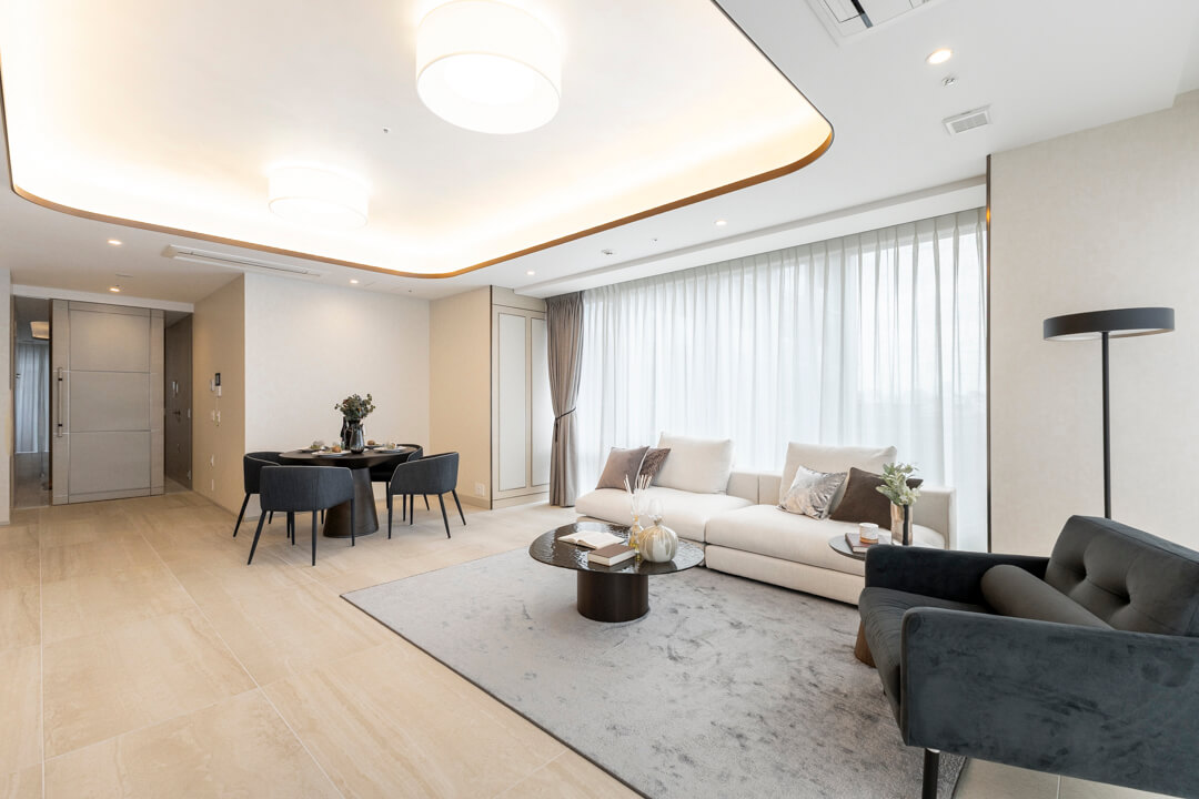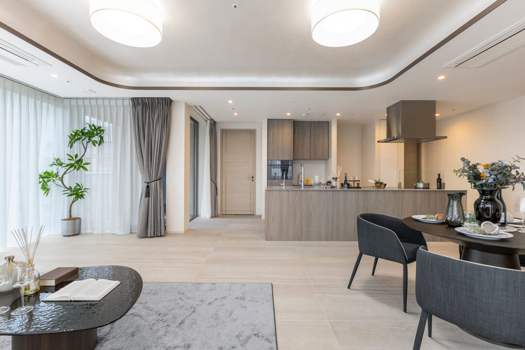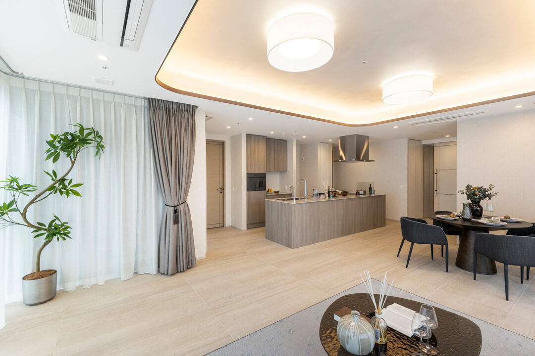 約32.8帖の広々としたLDK。ハイサッシを採用した3面採光で、明るく開放感たっぷりです。窓からは遠く広がる青空や中庭の豊かな緑が見えます。カーブを描いた折り上げ天井に間接照明が施され、上質な空間を演出。光のグラデーションがリラックスタイムへ誘ってくれそうです。