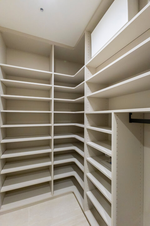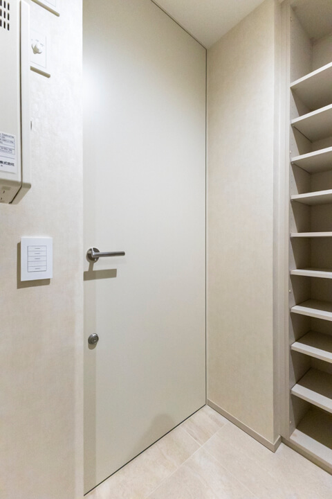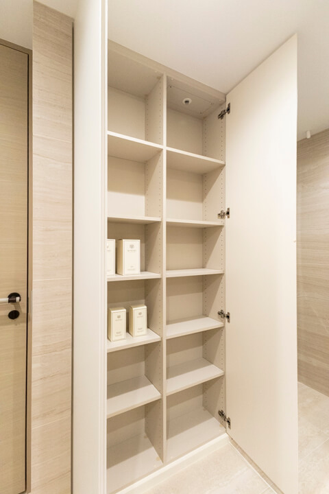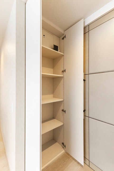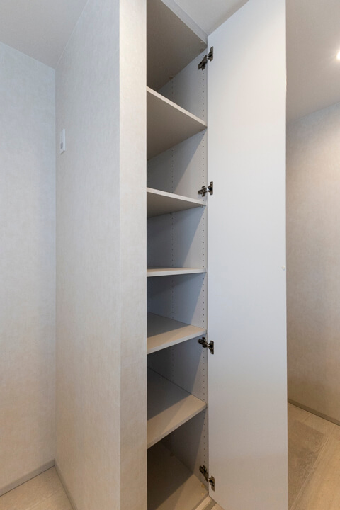 LDKに入ってすぐ右手には可動棚収納を完備しています。書類や生活小物、日用品ストック等の収納に便利。すっきりとしたリビング空間をキープできそうですね。