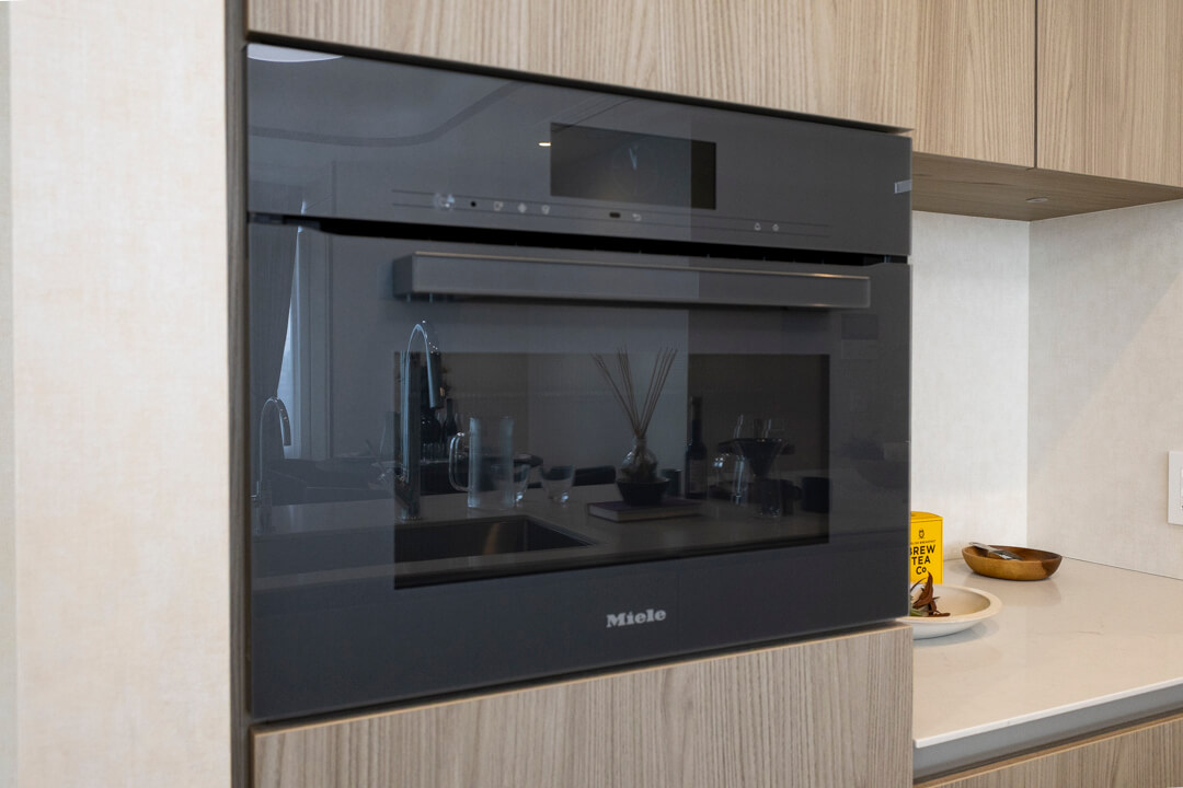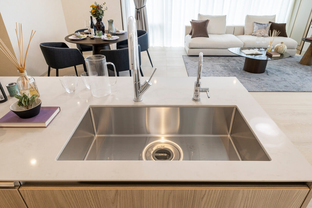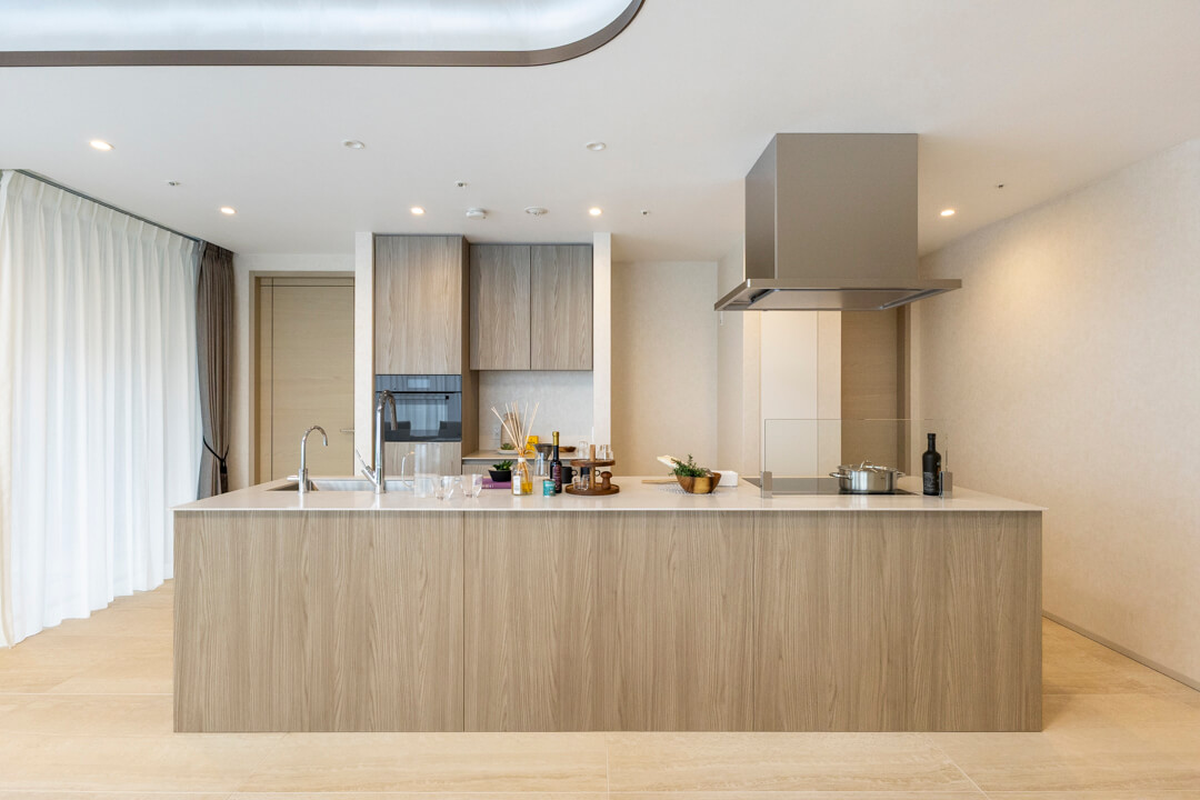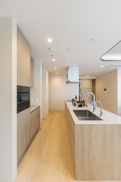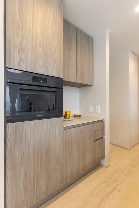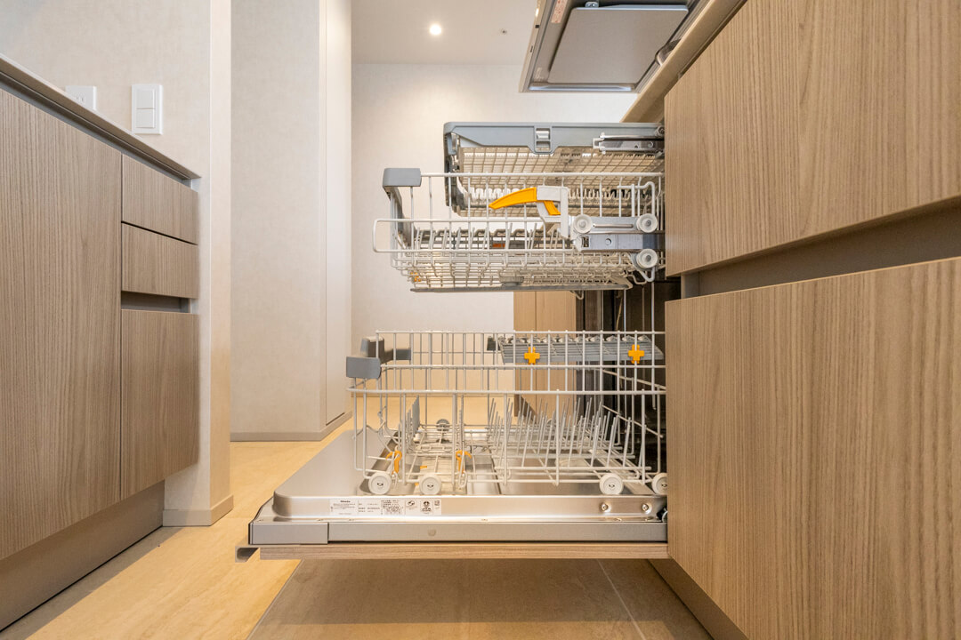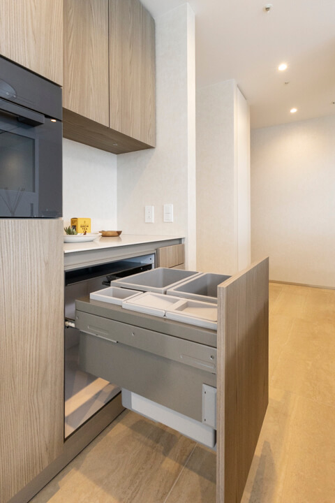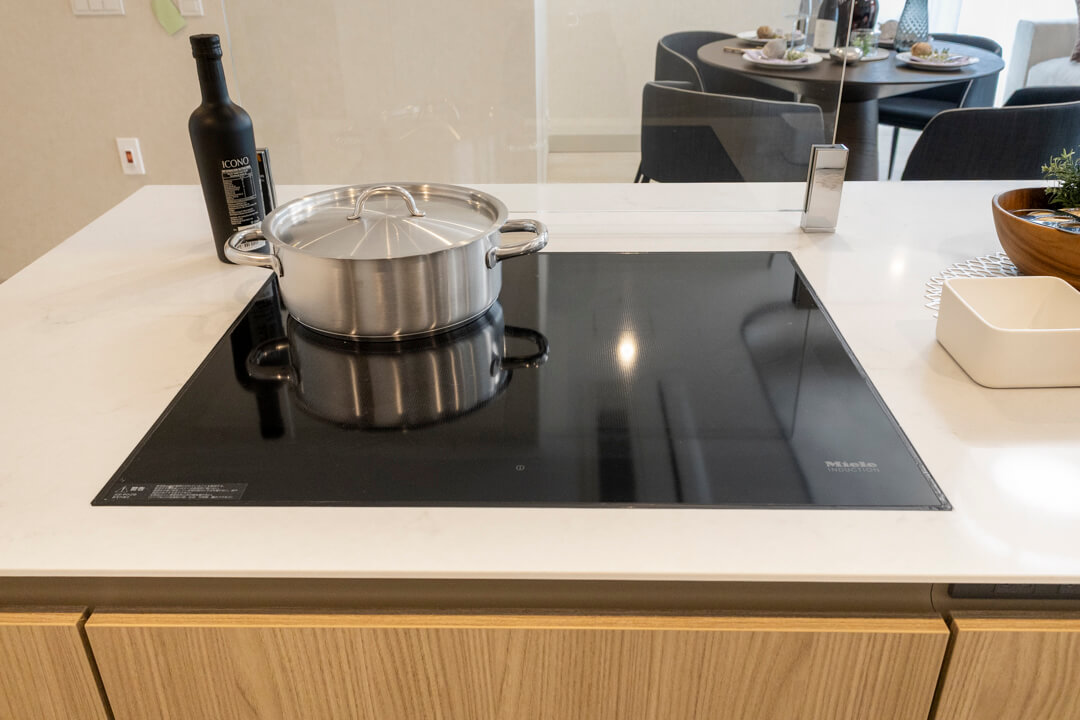 Miele(ミーレ)製のIHクッキングヒーター・オーブン・大容量食洗機を完備しています。調理も後片付けも捗りそうですね。IHはスイッチで火力を調節でき、ガスコンロよりも調整が簡単。凹凸がなくフラットでお手入れがしやすいのも魅力的です。ディスポーザーも搭載されているので、掃除の手間が軽減され、悪臭の原因を防いでくれます。