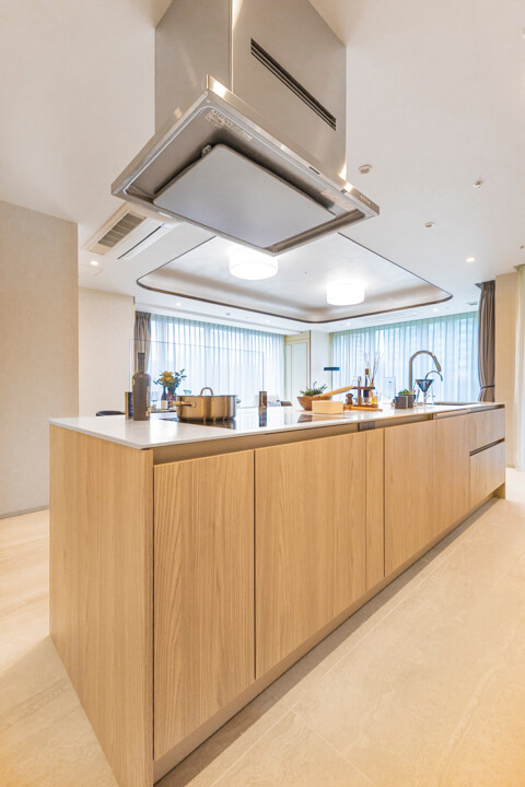 存在感がありながらも、木目デザインが空間に調和するキッチン。開放的なアイランドタイプです。左右から出入りでき、効率良く動くことができますよ。リビングダイニングを見渡すことができ、家族のコミュニケーションも増えそうです。