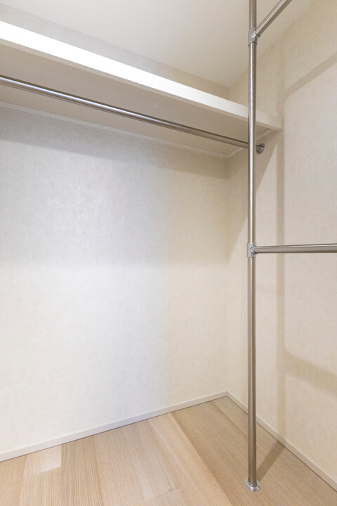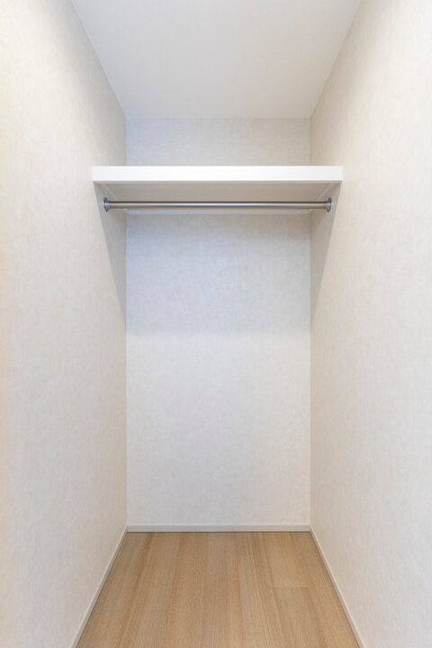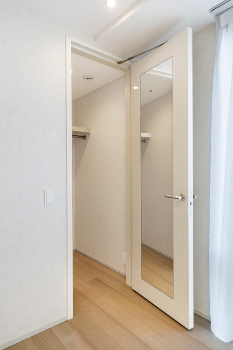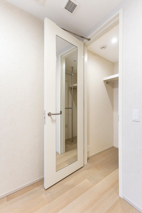 約0.9帖のWIC(ウォークインクローゼット)を完備。衣類はもちろん、トランクケースや季節家電といった大きな荷物も収納可能です。すっきり片付けて、居室空間を有効活用できそうですね。扉裏には全身鏡があり、コーディネートチェックに便利です。