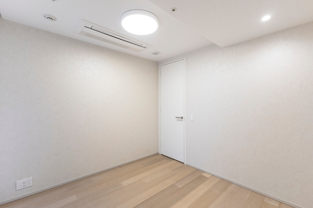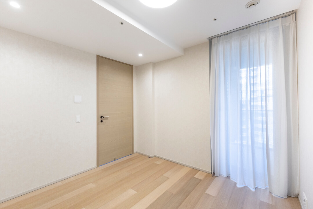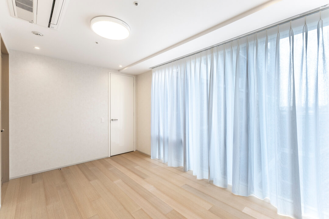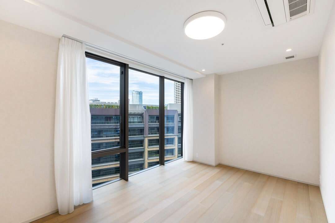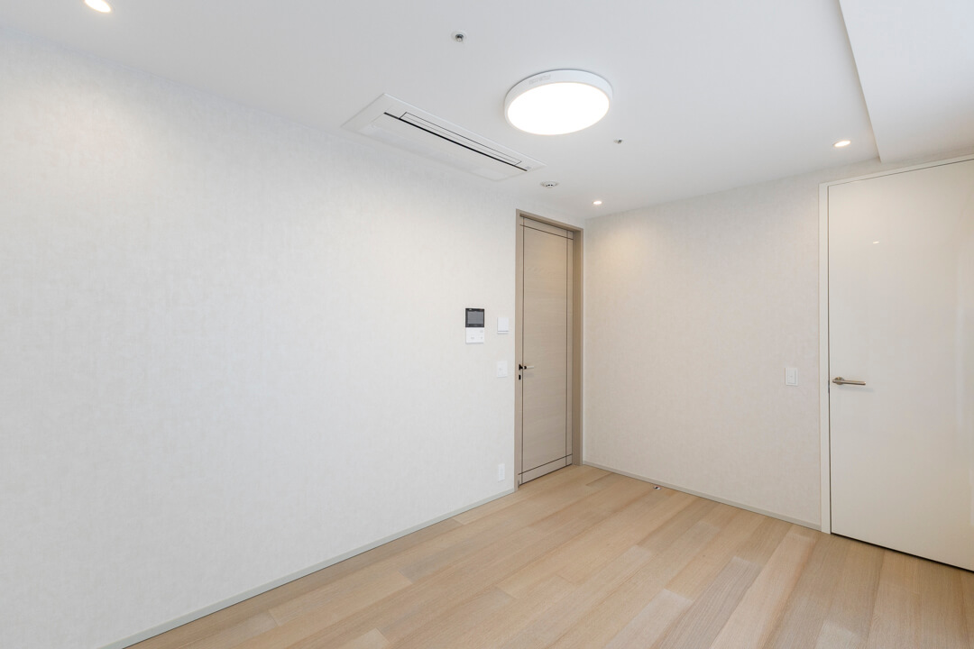 約8.1帖の主寝室。大開口の窓があり、開放的な空間です。リビング同様にビルトインエアコン&床暖房を完備していて、1年中快適に過ごすことができますよ。インターホンが設置されていて、急な来客時にリビングまで行く手間がかからないのも嬉しいポイントです。