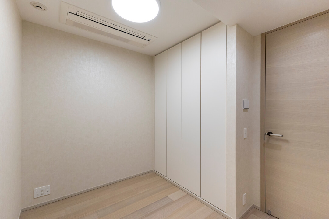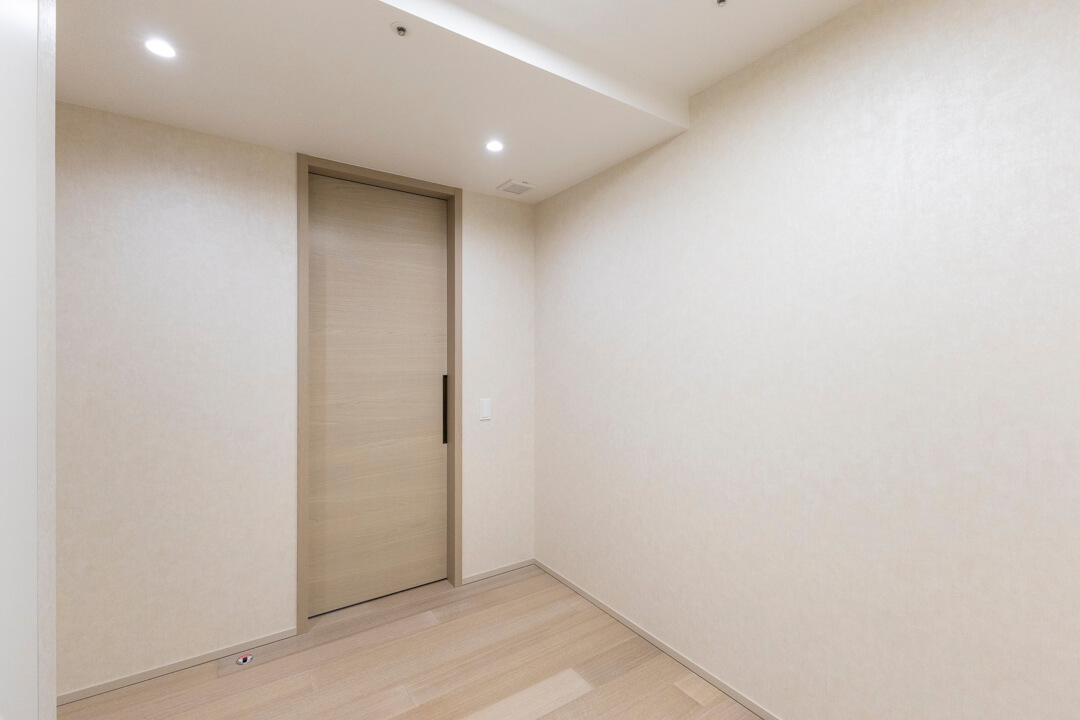 約4.2帖のサービスルーム。廊下とLDKからアクセスできる2way動線です。ほど良いこもり感があるので、ワークスペースや趣味部屋におすすめ。作業が捗りそうですね。天井まで高さのあるクローゼット、床暖房も完備しています。