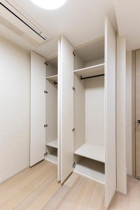 LDKに隣接する寝室。約6.2帖です。こちらのお部屋にもビルトインエアコンと床暖房を完備しています。約1.2帖のWIC(ウォークインクローゼット)付きで収納力◎。ハンガーパイプが2段になっていて、丈の短い洋服を効率良く収納できるのも嬉しいポイントです。子ども部屋におすすめです。