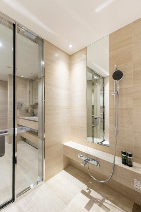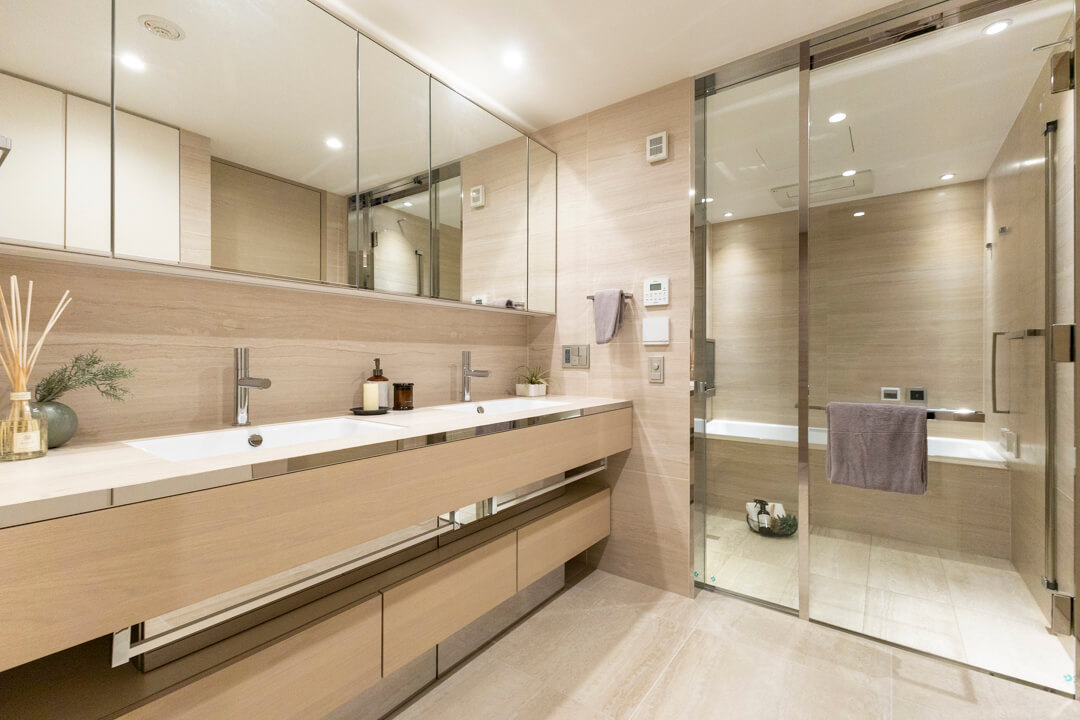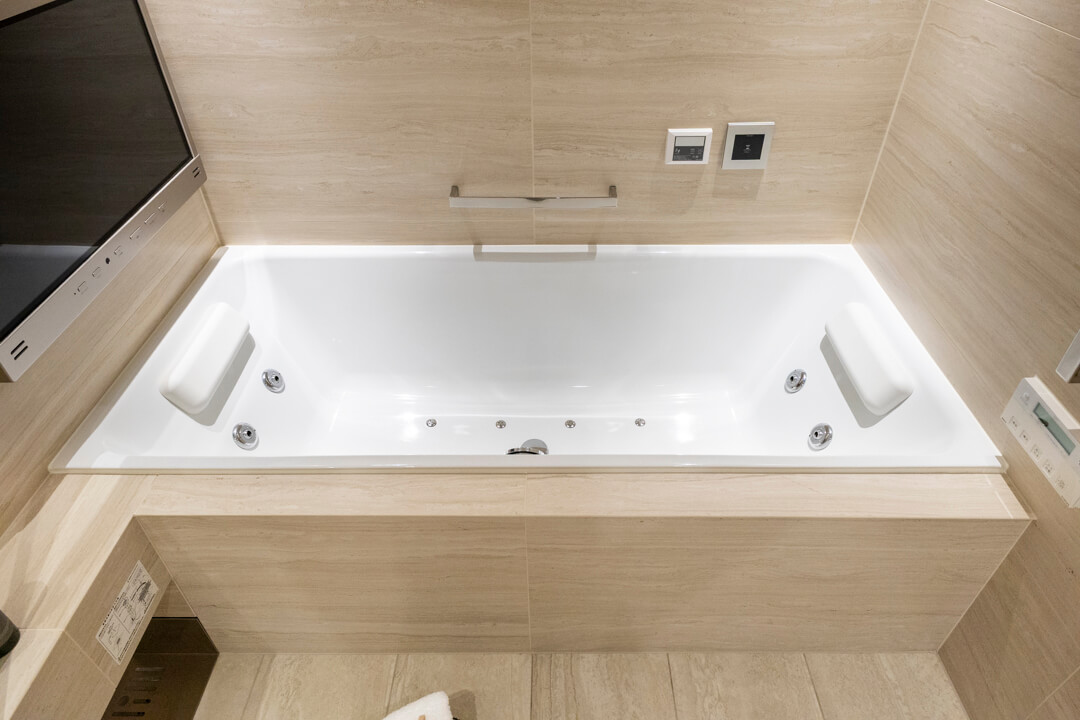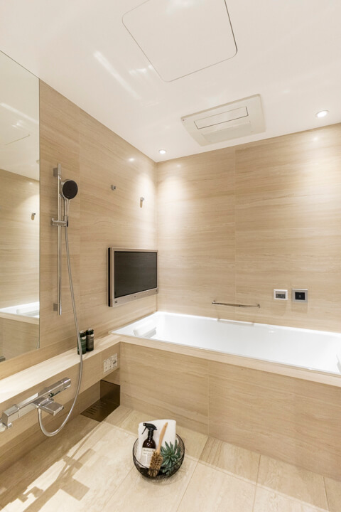 ガラス扉でラグジュアリーな雰囲気が漂うバスルーム。ゆったり入浴できる1822サイズです。浴槽壁面から心地よい気泡水流が噴出するジェットフォームバス&床面ノズルから湧き上がる気泡(エアブロー)が身体の隅々まで心地よくマッサージ。大型モニターも設置されていて、贅沢なリラックスタイムをお過ごしいただけます。浴室換気乾燥暖房機・追い焚き機能も完備しています。