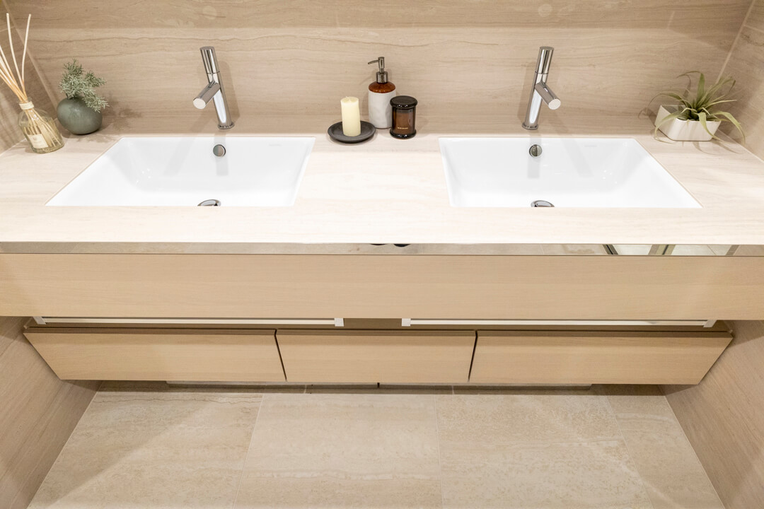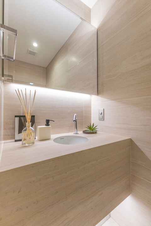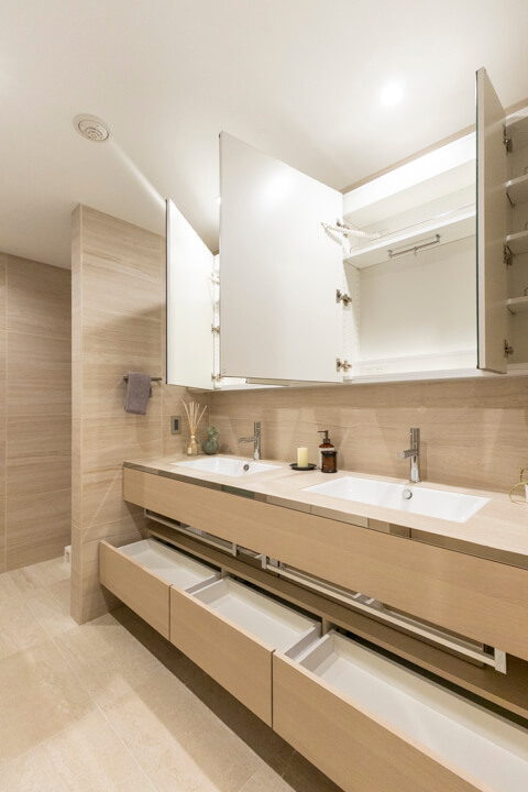 ホテルライクな2ボウル仕様の洗面化粧台。2人並んで使用でき、忙しい朝の身支度もスムーズに行うことができます。床暖房付きなので寒い時期も快適ですね。カウンター下にはハンガーパイプがあり、タオルを掛けることができて便利。洗面台本体の収納に加え、大容量のリネン庫も設置されていて、いつも清潔な洗面室をキープできそうです。