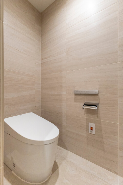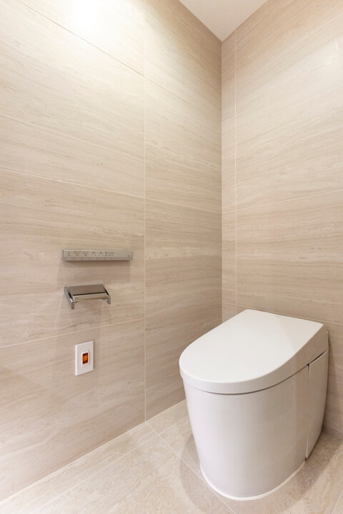 トイレは2ヶ所にあります。洗面室内にあるトイレは、プライベート用として家族で使用すると良いですね。もう1つは廊下に面していて独立性の高い空間です。こちらには手洗いカウンターが付いているので、ゲストを洗面室まで案内する手間がかかりません。