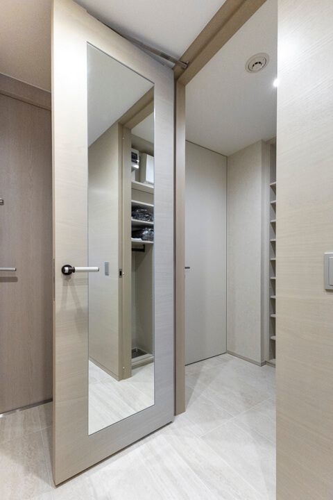 フルフラットで広々とした玄関ホール。リビング側から漏れる光が、その先の明るい時間を彷彿させます。建具は壁と統一したデザインで、すっきりとした印象に。履いて左手には約1.7帖のSIC(シューズインクローゼット)を完備しています。使い勝手の良い可動棚で、ロングブーツやレインシューズ、傘なども収納可能。扉裏に鏡が付いていて、お出かけ前の身だしなみチェックができるのもポイントです。