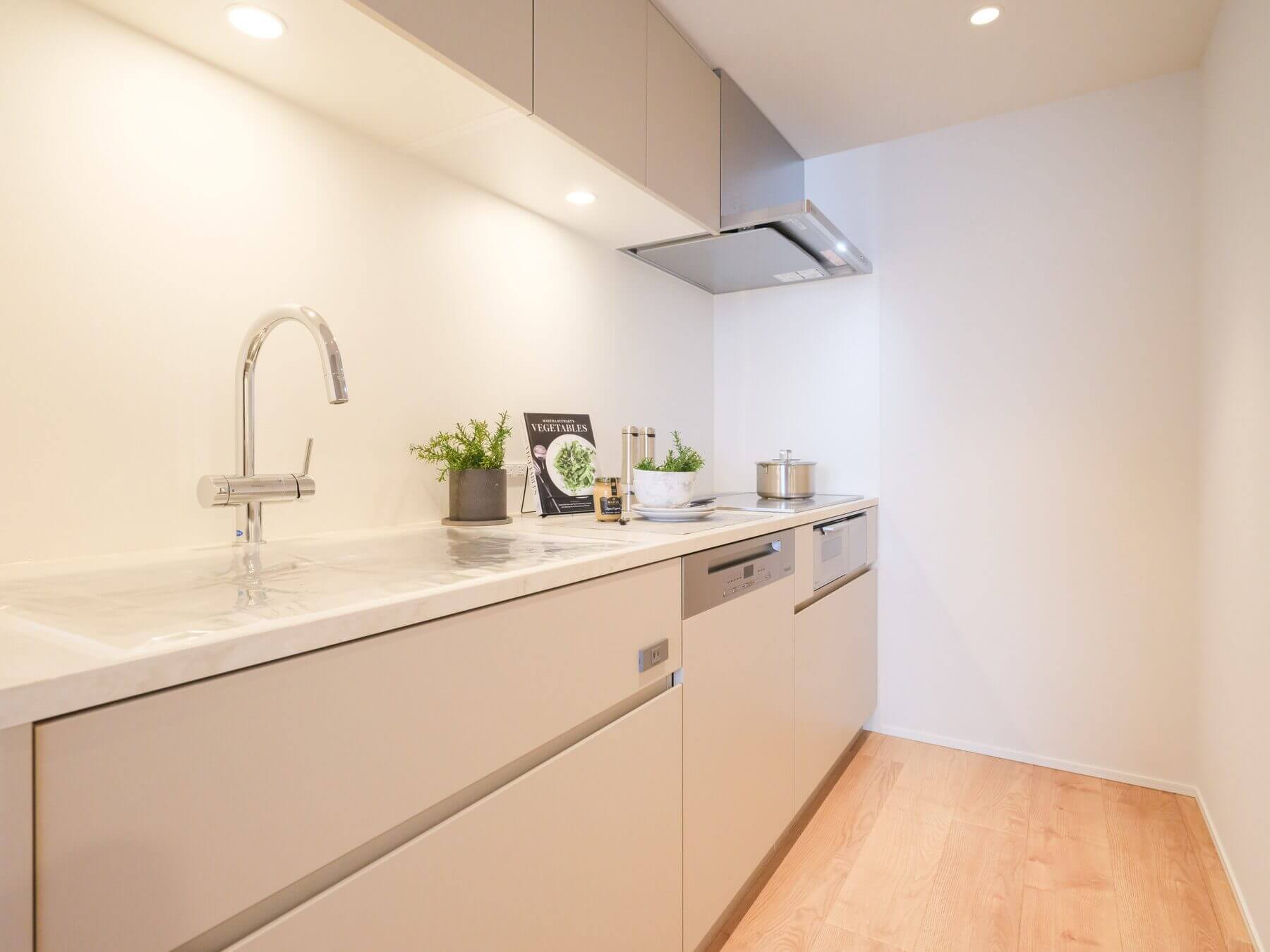 約4.5帖の独立キッチン。調理に集中でき、生活感が出やすいキッチンまわりをさりげなく目隠しできます。調理中のにおいが生活スペースに広がりにくいのも嬉しいですね。グリル付3口ガスコンロ・食洗機内蔵で調理も後片付けも捗りそうです。