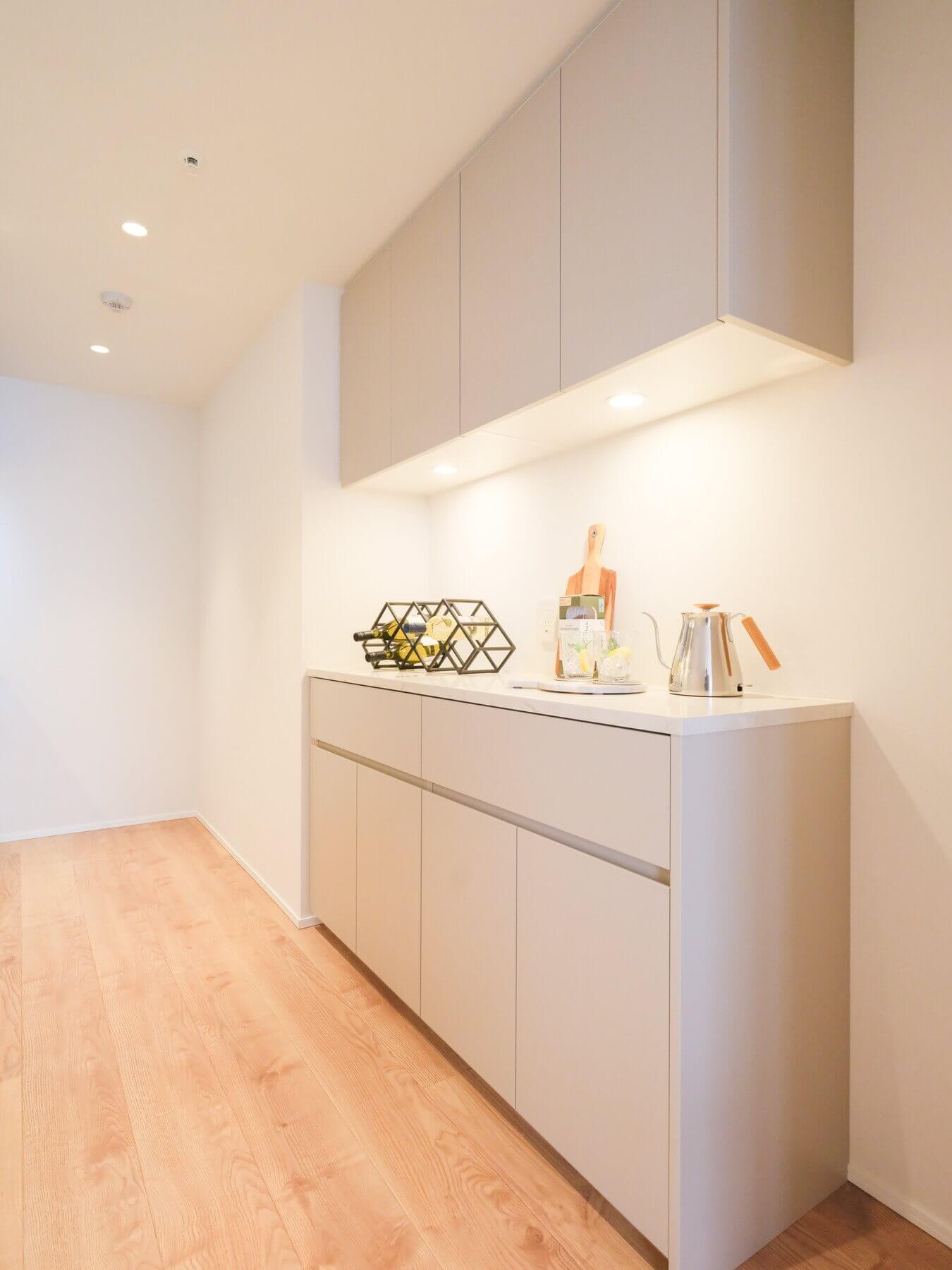 背面には収納力のあるカップボードを完備。キッチンと同じデザインで統一感があります。食料品のストックや食器類を整理整頓でき、ごちゃごちゃしがちなキッチンまわりがすっきり片付きそうです。