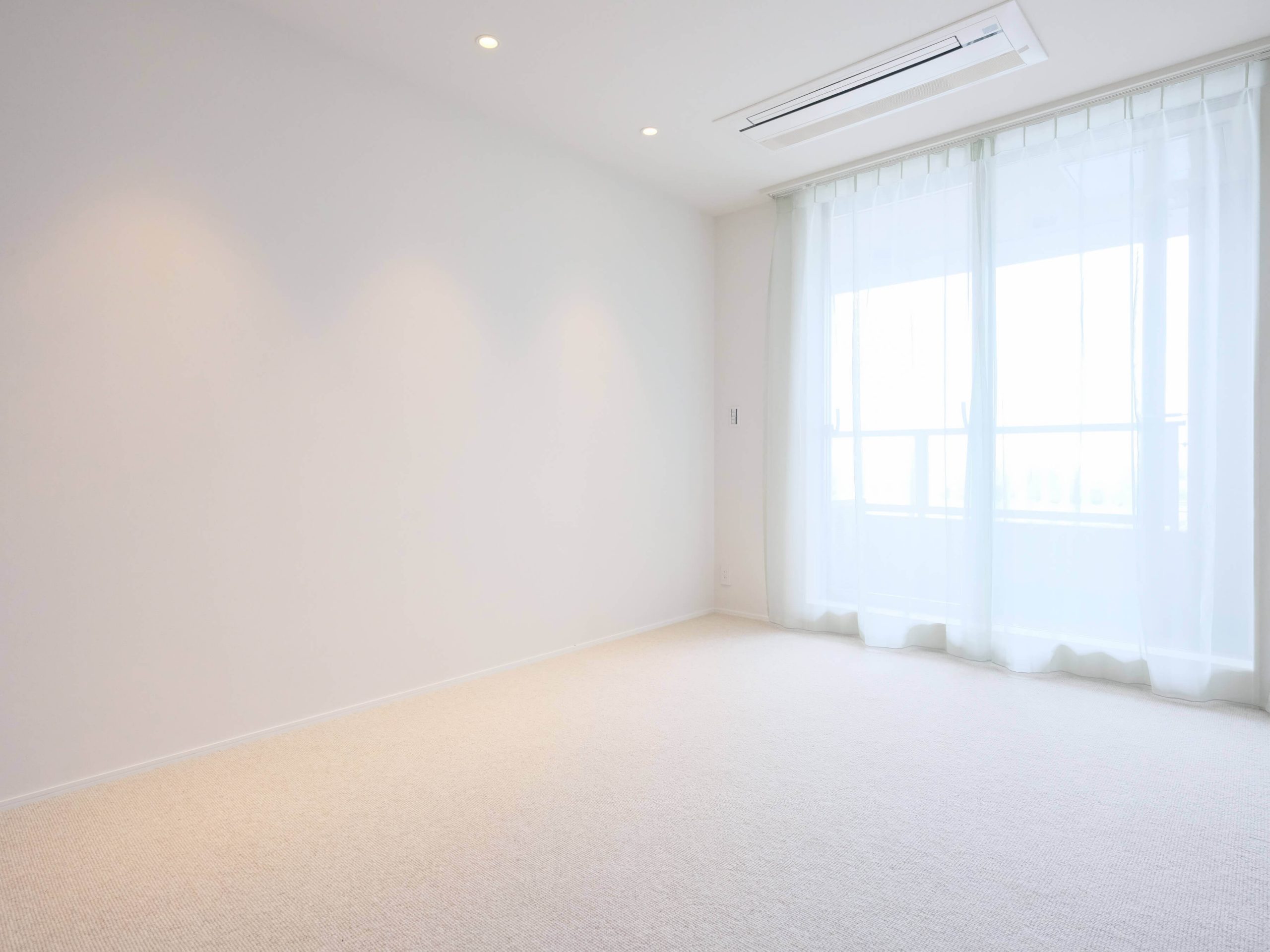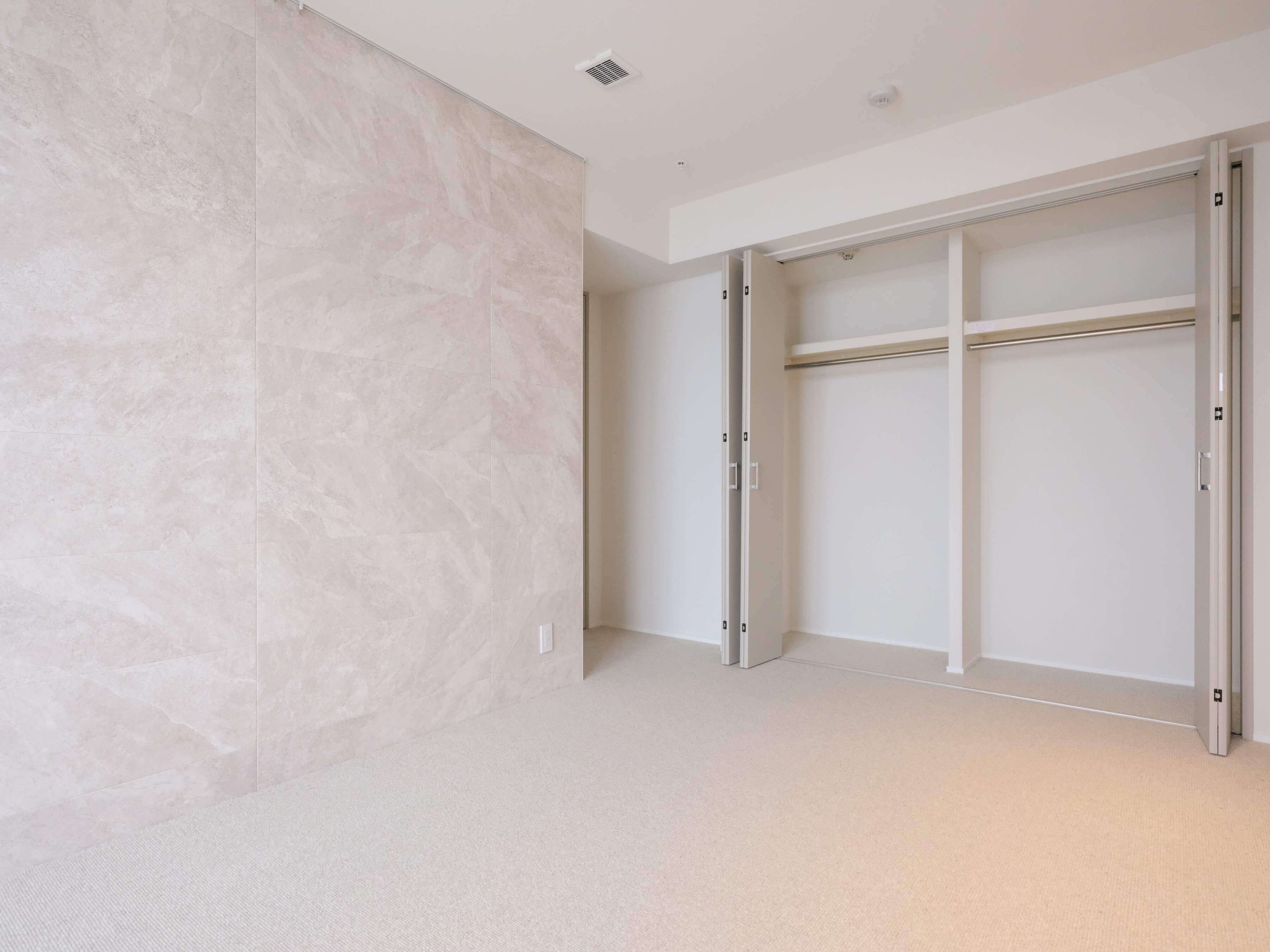 約7.2帖の洋室1。独立性が高く、落ち着いて過ごすことができます。広さもあるので、主寝室にぴったりですね。ふかふかのカーペットフロアで開放感◎。石目柄のエコカラットがアクセントになり、上質な空間を演出します。調湿・脱臭機能付きなのも嬉しいポイントです。