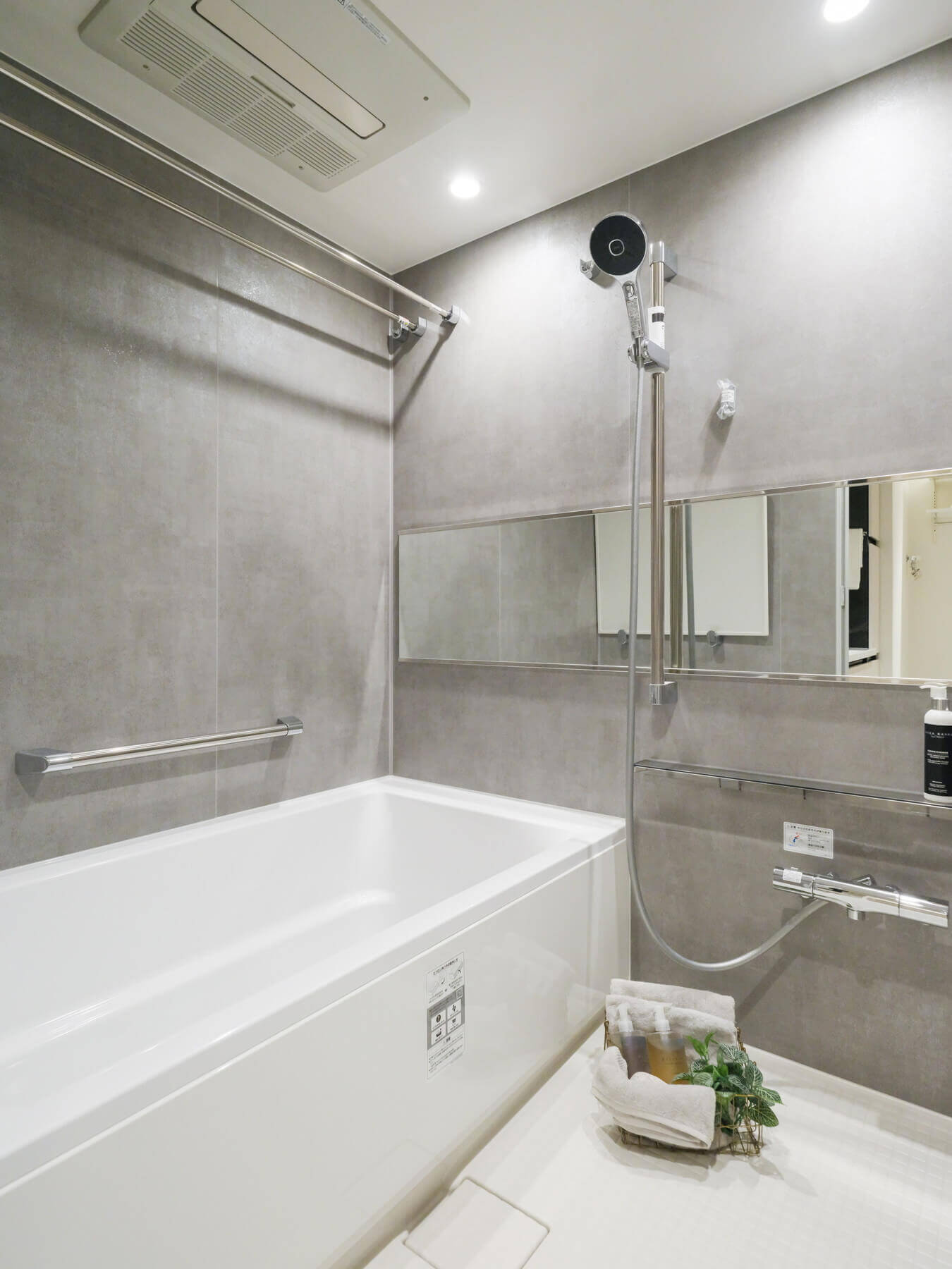 モノトーン調でシックな印象のバスルーム。ワイドミラーが奥行きをもたらします。カビ対策や雨の日のお洗濯に重宝する浴室換気乾燥機を完備。1日の疲れを癒すリラックスタイムを過ごせそうです。