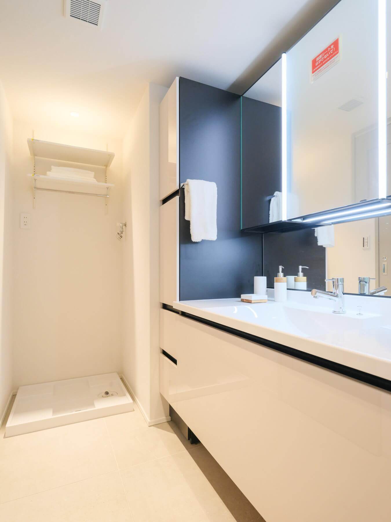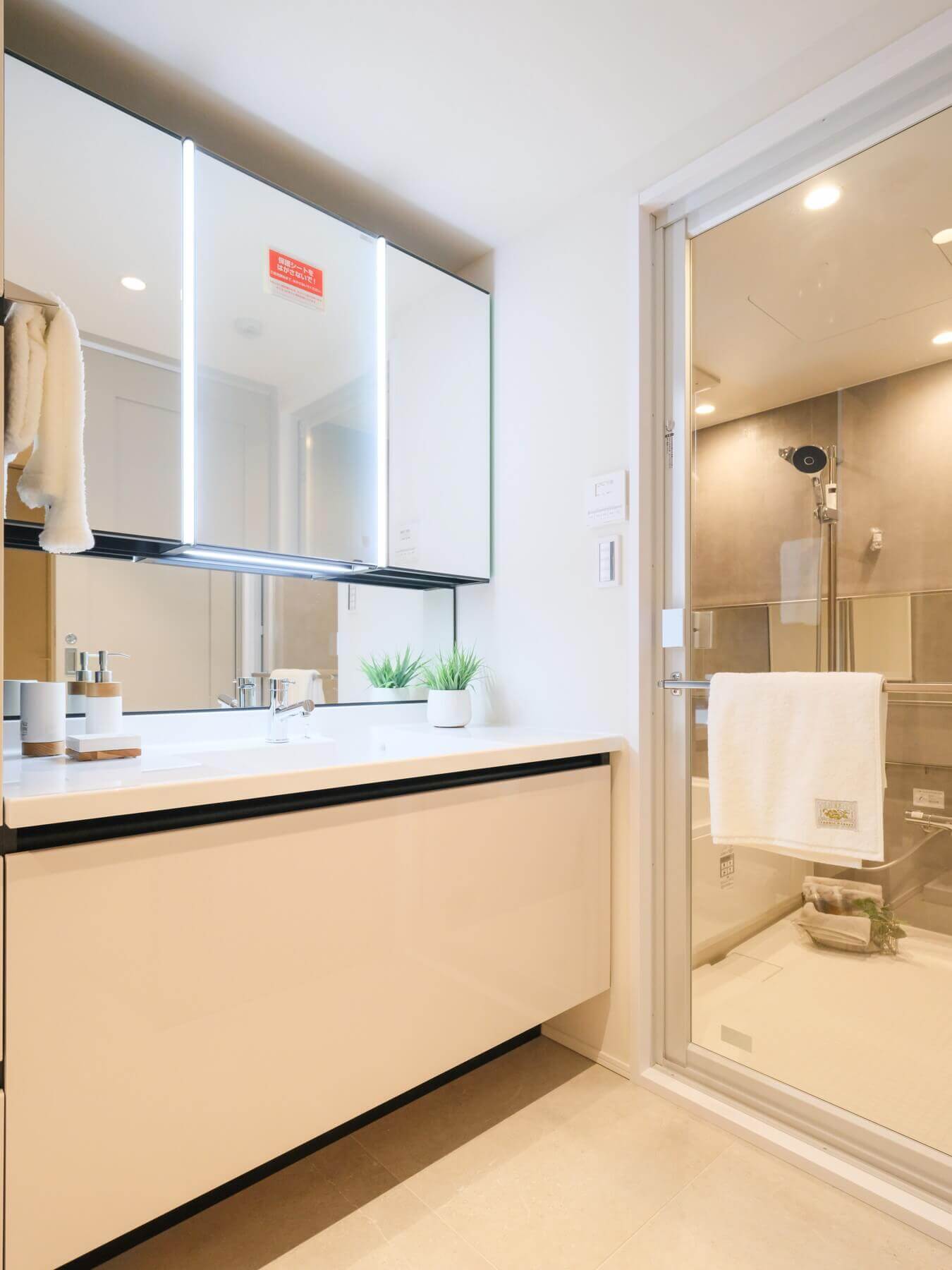 白基調で明るく清潔感のある洗面化粧台。大きな三面鏡には縦型の照明が入っていて、顔全体をしっかり照らしてくれます。顔に影ができにくく、お化粧がしやすいですね。ミラーボックス&足元の引き出しに加え、リネン庫も完備していて収納豊富です。