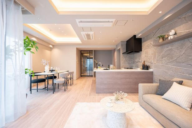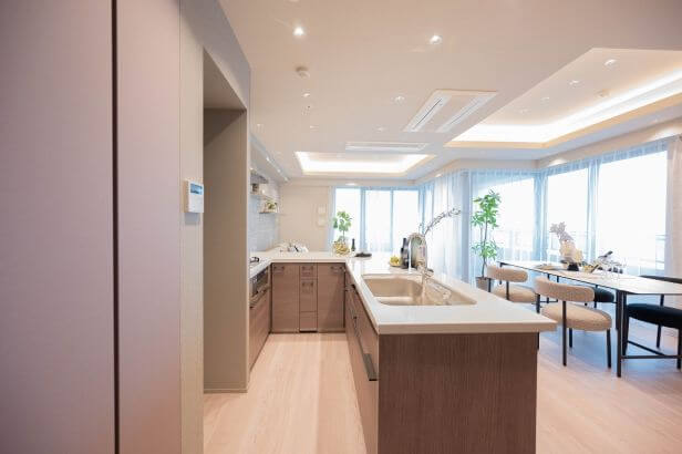 約22.0帖の広々としたリビングダイニングキッチンです。二面採光で開放感があり、通風が良好。リビングスペースとダイニングスペースとが、さりげなく分けられているので、それぞれの時間を堪能することができますよ。
