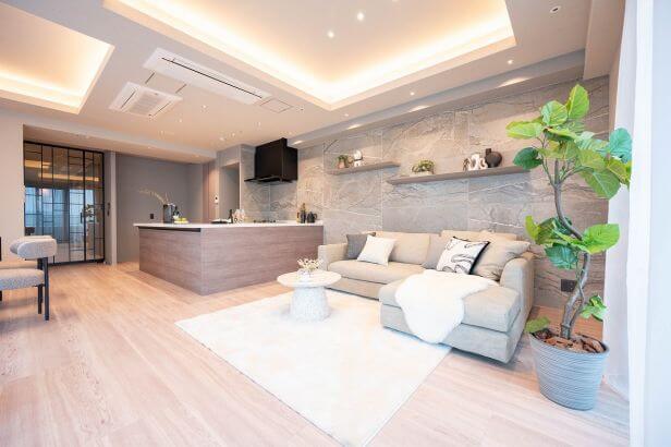 折り上げ天井には間接照明があしらわれ、壁面には飾り棚やアクセントクロスが設置されて、お部屋を上品な雰囲気に演出してくれています。