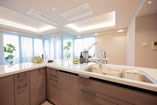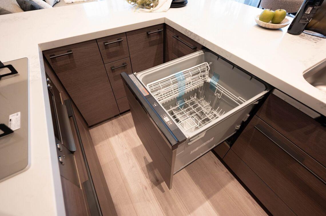 3口コンロ、グリル、食洗機付きと設備面も充実しています。シンクも広々としているので野菜などが洗いやすそうですよ。