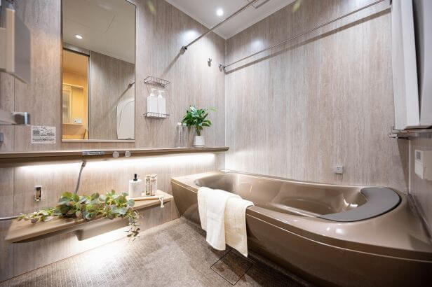 重厚感が漂うバスルームです。お風呂にゆっくり浸かるのが好きという方に嬉しい追い焚き機能を搭載。家族の入浴時間がずれてしまっても安心です。浴室乾燥機も搭載されているので、雨の日の洗濯物にも困りません。また、浴槽にはヘッドレストが設置されており、優しく首元を支えてくれますよ。