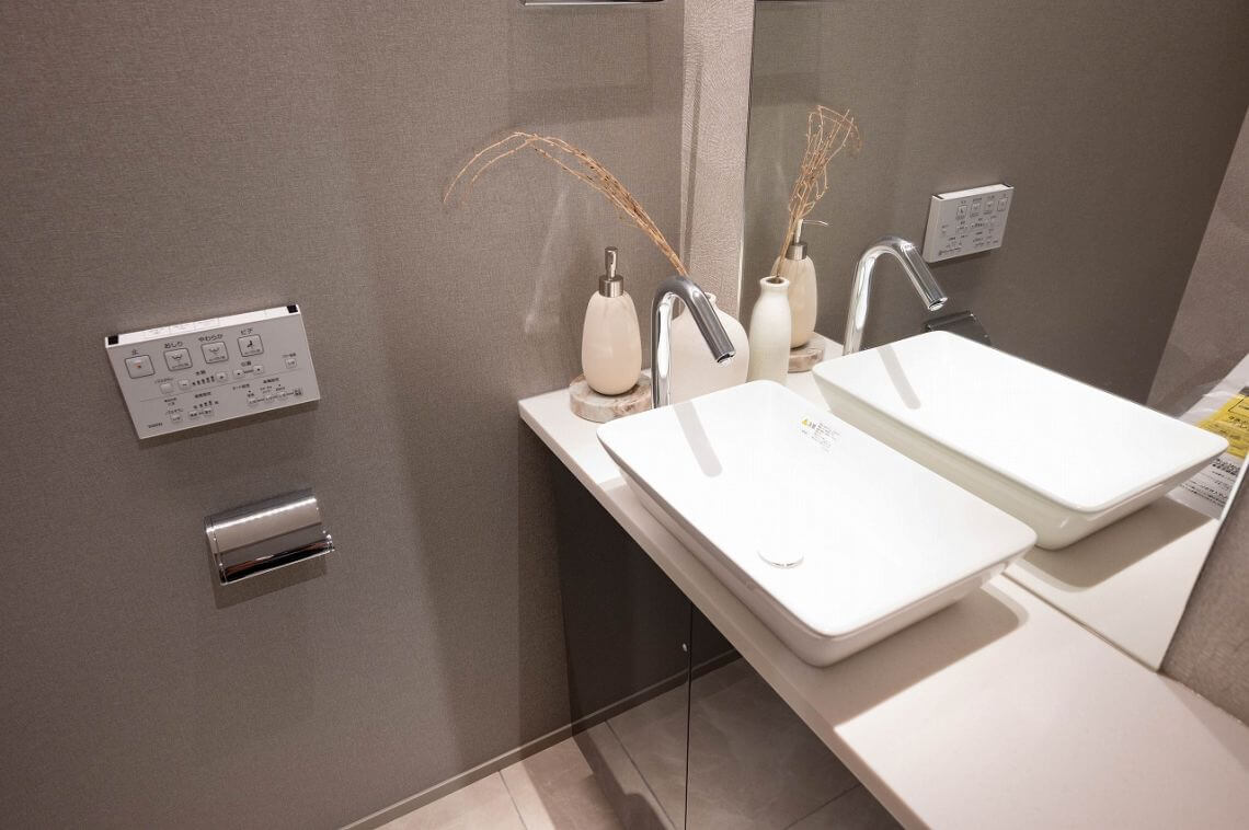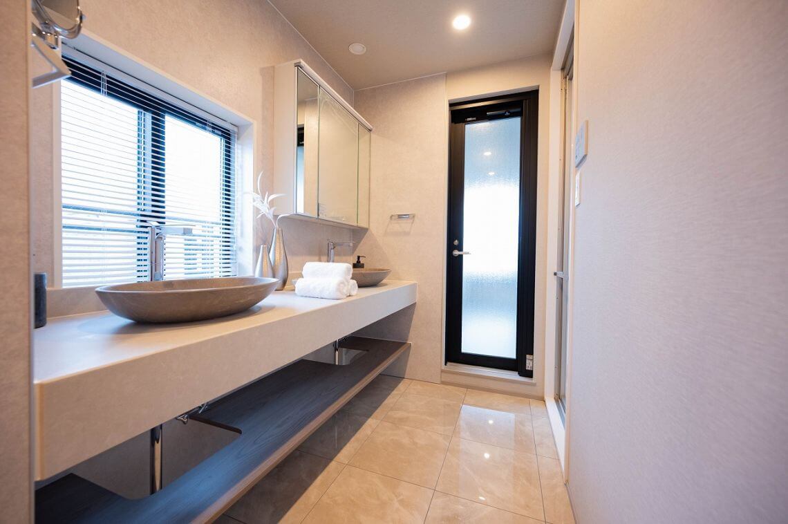 置き型式の洗面ボウルがおしゃれで、ホテルライクな化粧台は2ボウルです。忙しい朝でも並んで支度ができて便利。三面鏡の中には化粧品などが収納できて使い勝手も良好です。また、窓があるので換気ができ、明るさもプラスしてくれています。