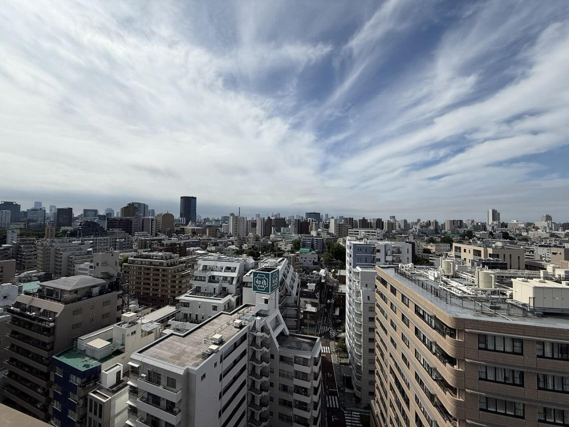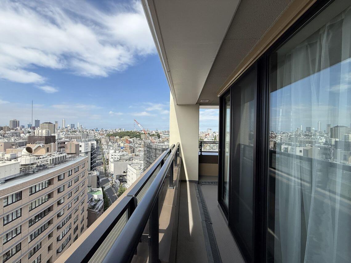 東側のバルコニーはL字でゆとりのある空間です。16階部分のため、目の前には開放感溢れる眺望が広がっています。