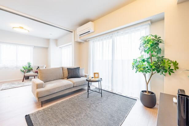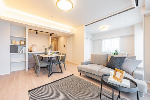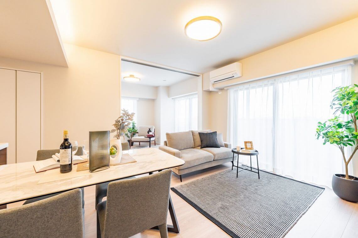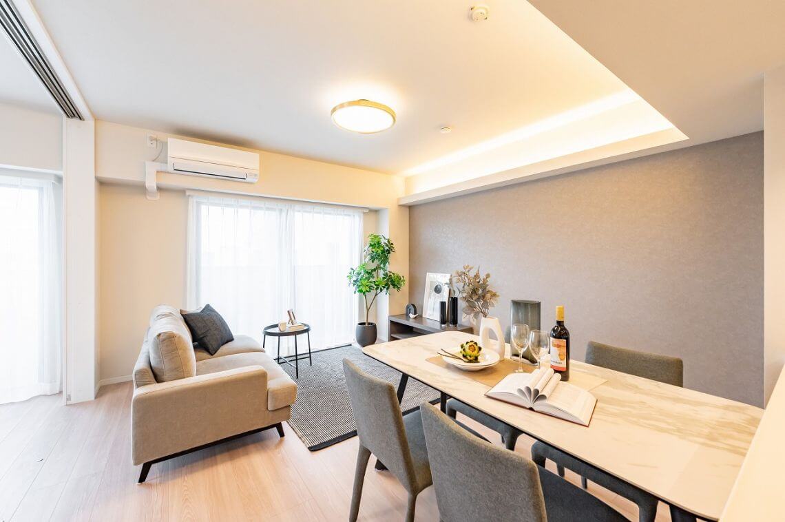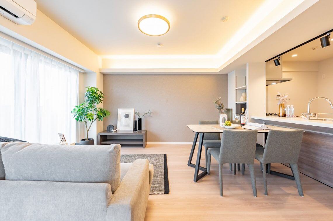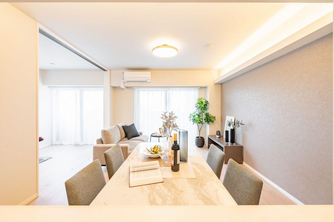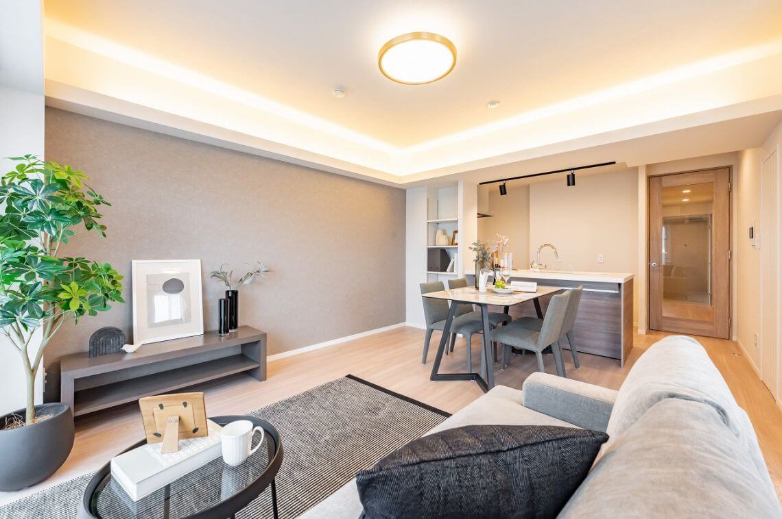 キッチンスペースを含め、約14.8帖のLDK。グレーのアクセントクロスで落ち着きのある雰囲気。天井には間接照明が施されていて、空間をやさしい光で照らしてくれます。朝の光が心地い南東向きで陽当り良好。隣接する洋室と繋げてより広々と過ごせます。床にドアレールがないので見た目もすっきりとした印象です。