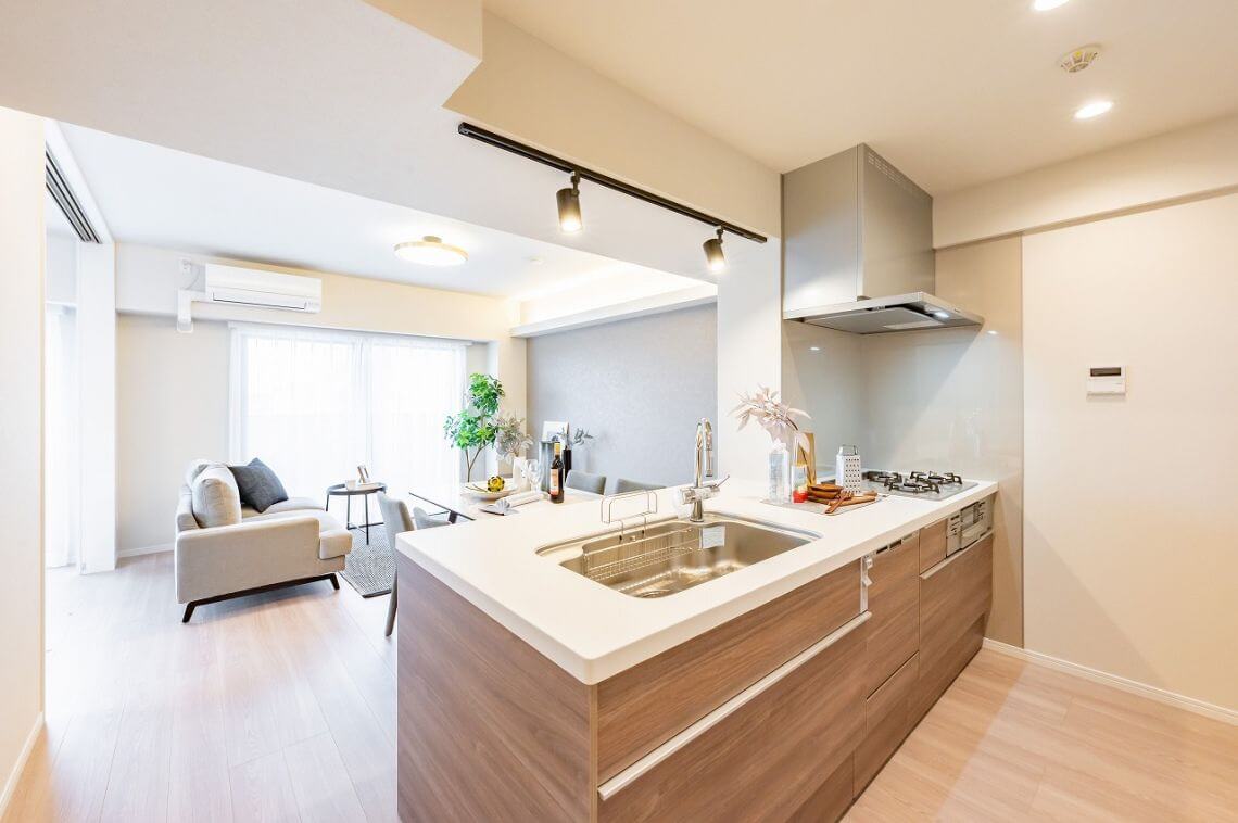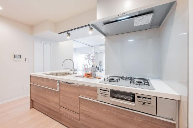 家族やゲストと会話が弾む、対面型のシステムキッチン。小さなお子さんがいるご家庭では子どもの姿を見守れます。料理が捗る3口ガスコンロ、家事の時短に心強い食洗機付きで設備も充実しています。