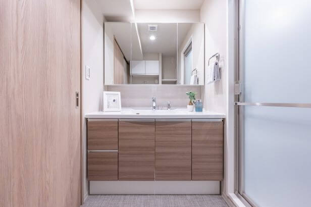 洗面化粧台は洗面まわりの小物がすっきり整頓できるミラーボックス付きでいつでも整った状態をキープできそう。カウンタースペースもゆとりがあり、アートや植物なども飾れます。