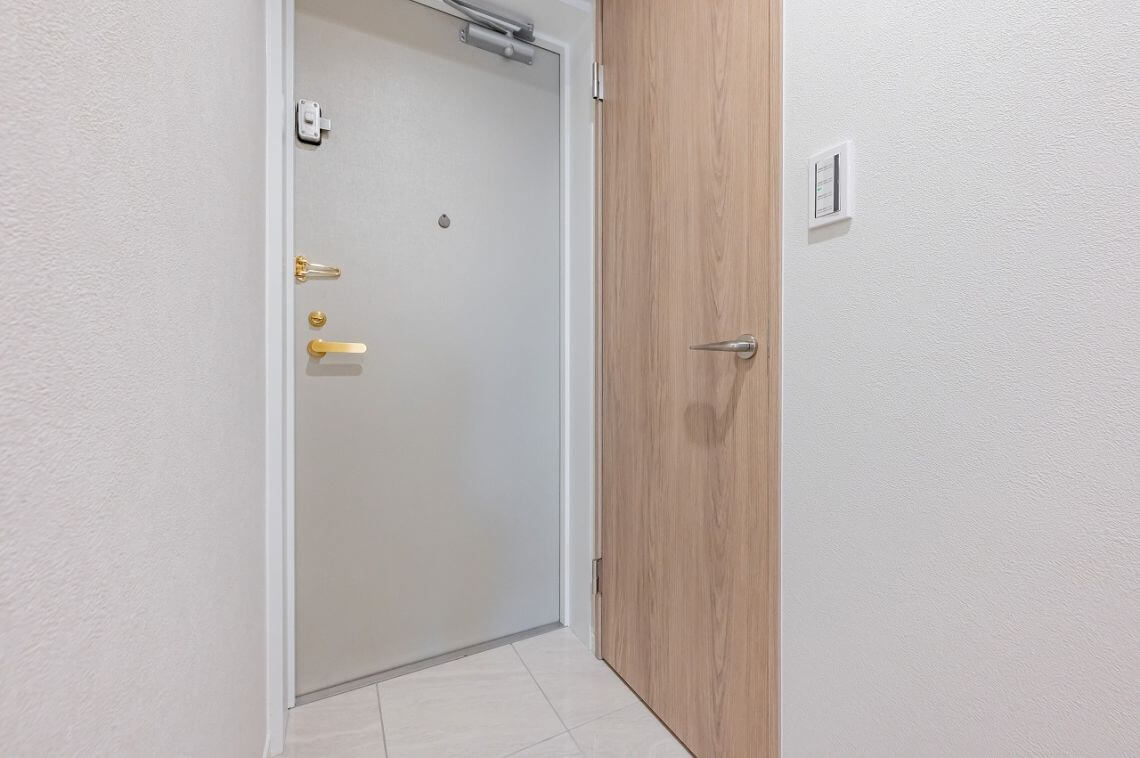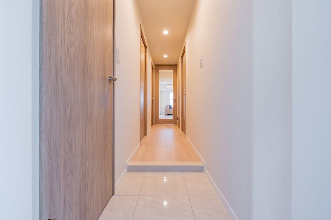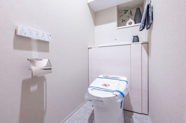 廊下に面したレストルーム。タンクが目隠しされていて、すっきりとした印象です。ウォシュレット、収納スペースも備わっています。