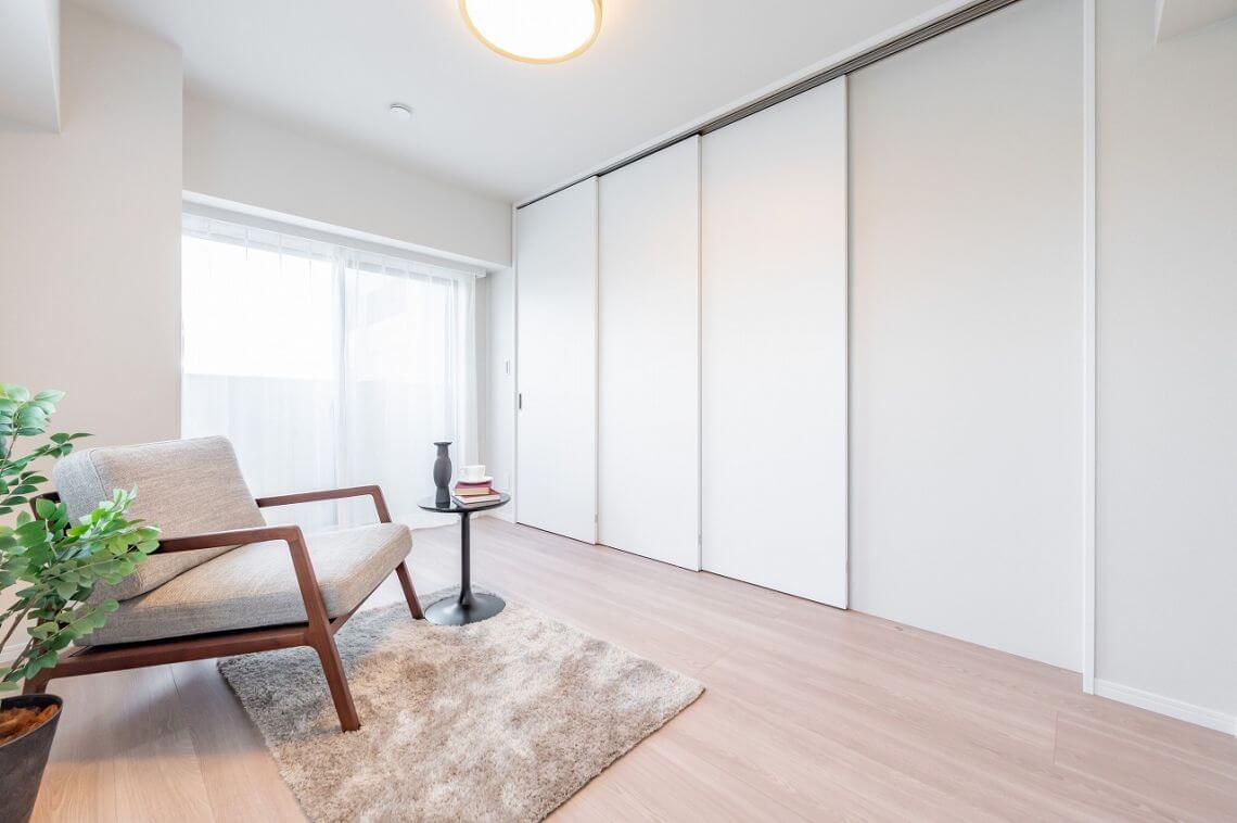 リビングダイニングと隣接した約7.0帖の洋室3。扉の開口部が広く取られており、全開にするとより広々と過ごせます。床にドアレールがないので見た目もすっきりとした印象。また、二面採光で自然な光がたっぷり入る開放感のある空間。バルコニーへの出入りも可能です。