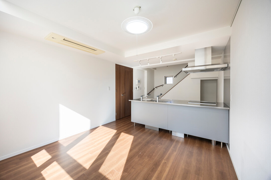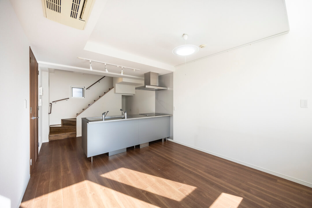 2階・3階のメゾネット住戸。リビングダイニングは2階部になります。キッチンスペースを含め、約13帖のLDK。南向きで太陽の光が入る心地よい空間です。壁にはピクチャーレールが設置されており、キズをつけずにアートや写真が飾れます。