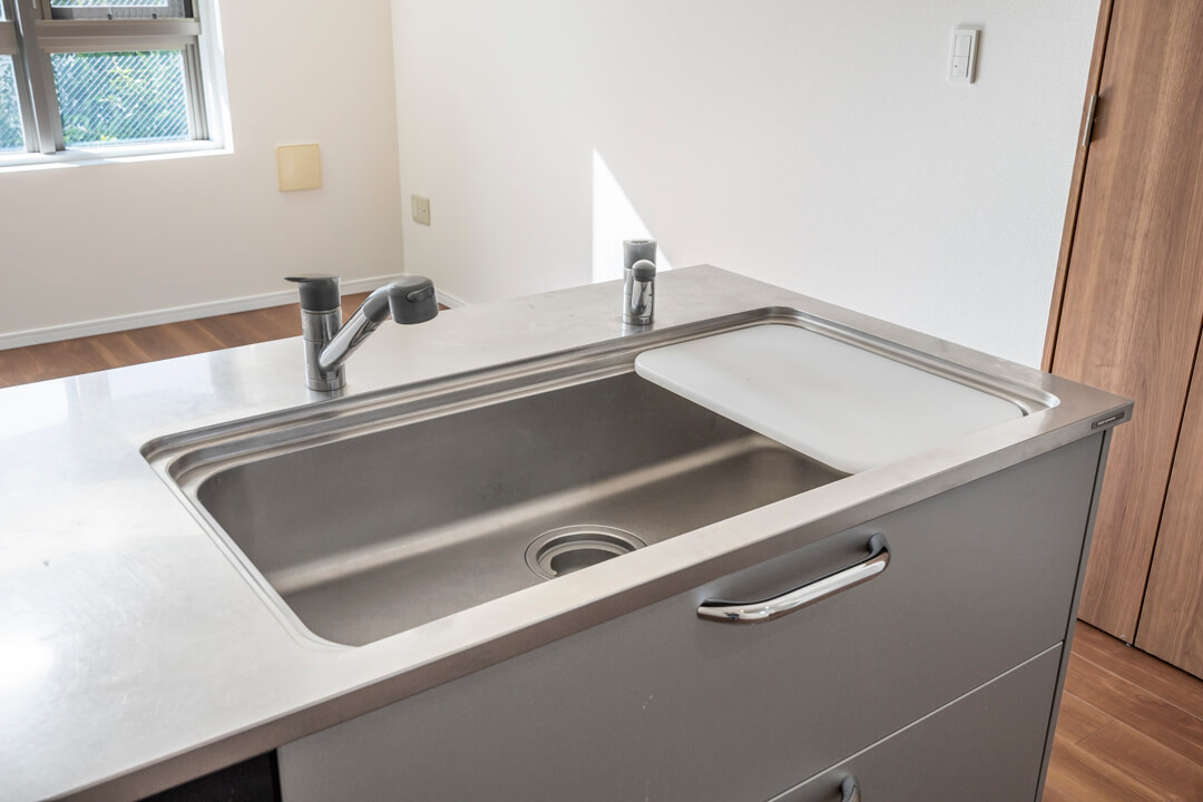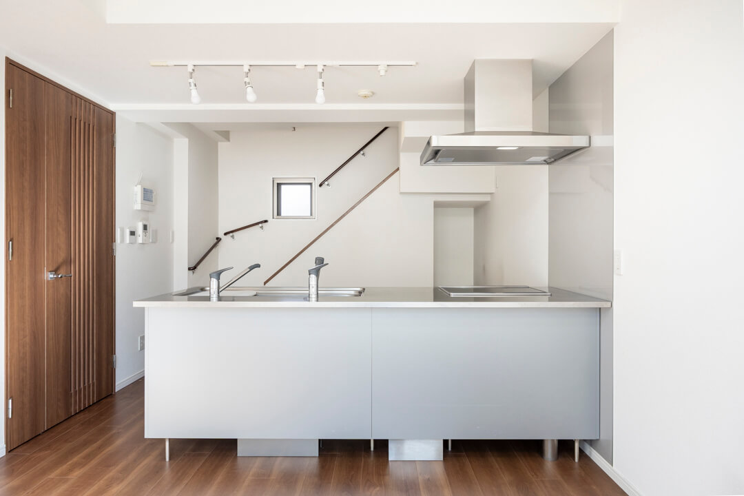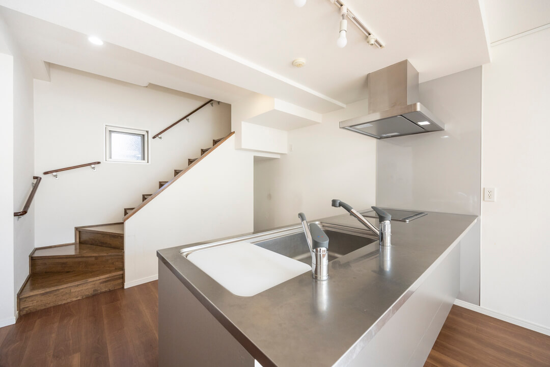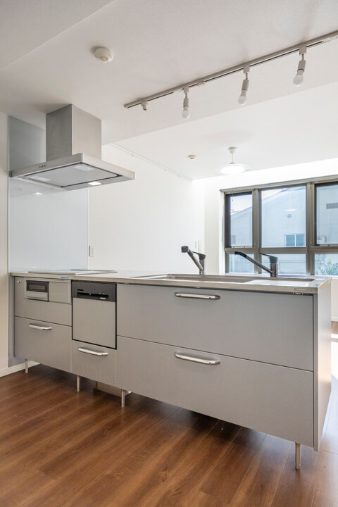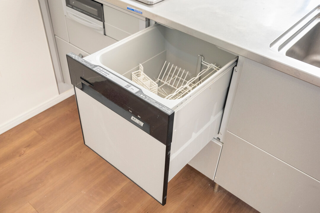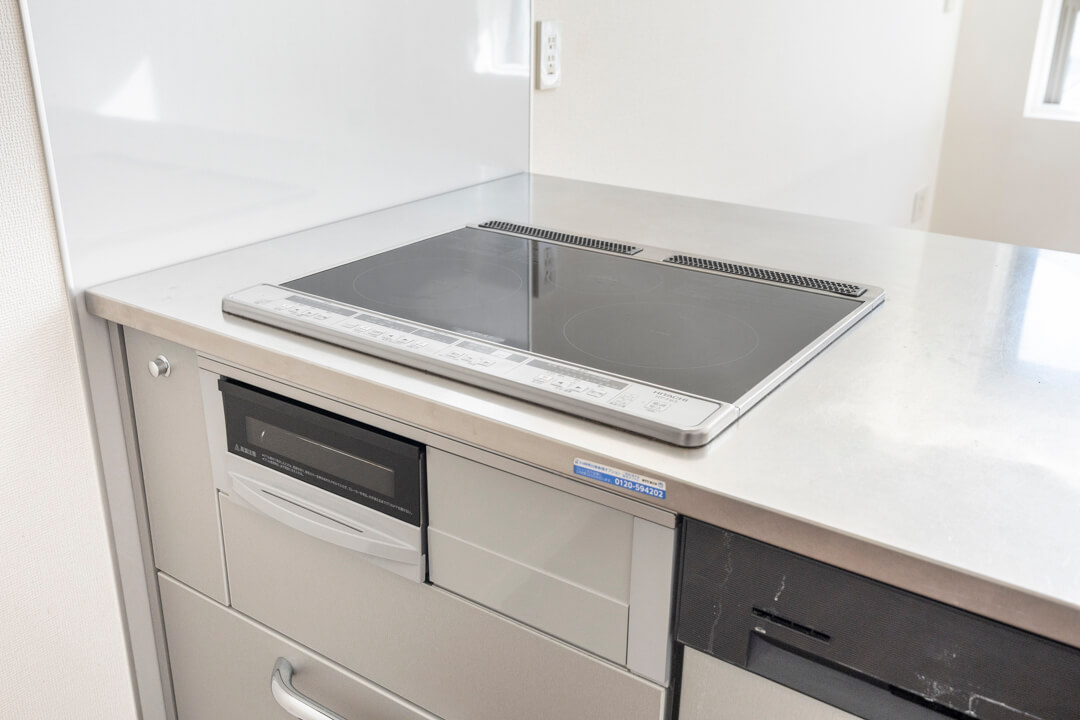 開放的なオープンキッチン。家族やゲストとコミュニケーションが取りやすく、小さなお子さんがいるご家庭では子どもの姿も見守れます。手入れがしやすいIHクッキングヒーター、家事の時短に心強い食洗機付きで設備も充実しています。