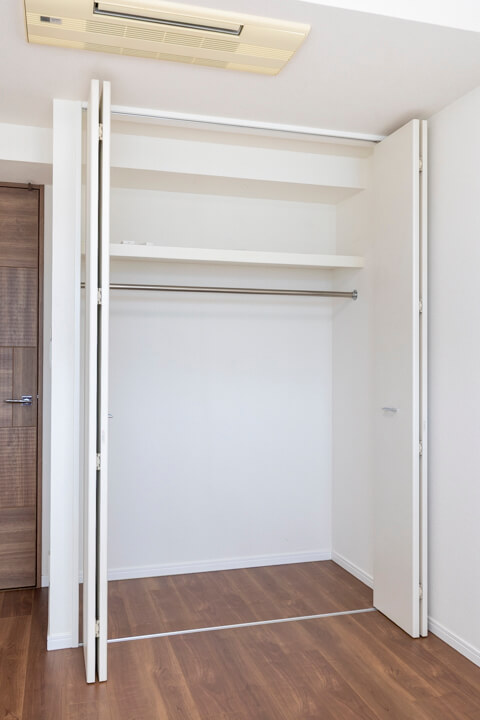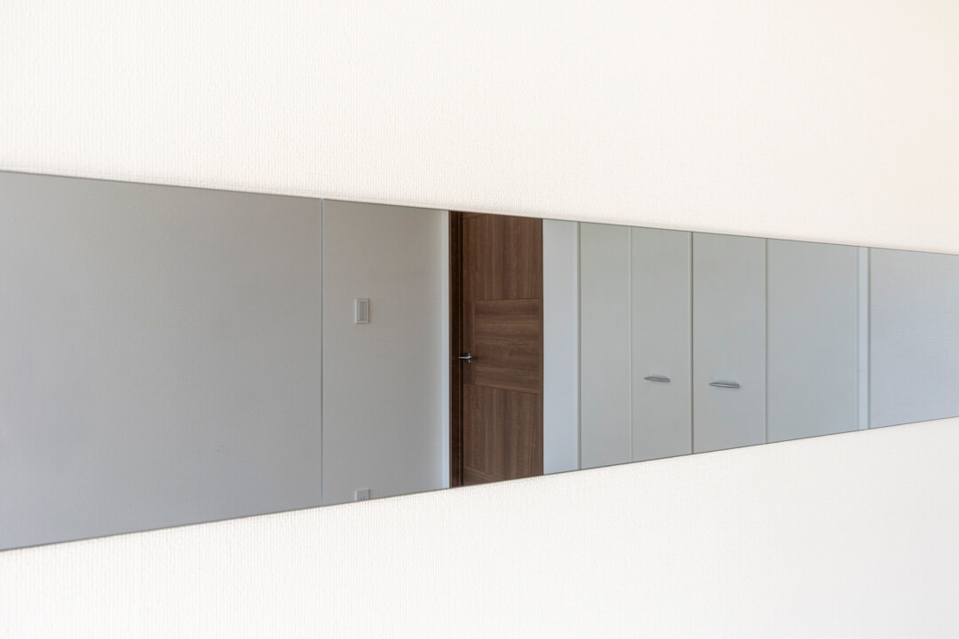 約9.0帖の洋室1。ミラーラインのアクセントウォールが印象的。南向きで陽当たり・眺望良好です。奥行きのあるWIC(ウォークインクローゼット)付きで収納スペースも充実。クローゼット内には小窓が付いています。