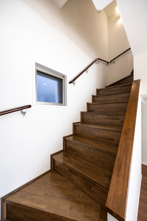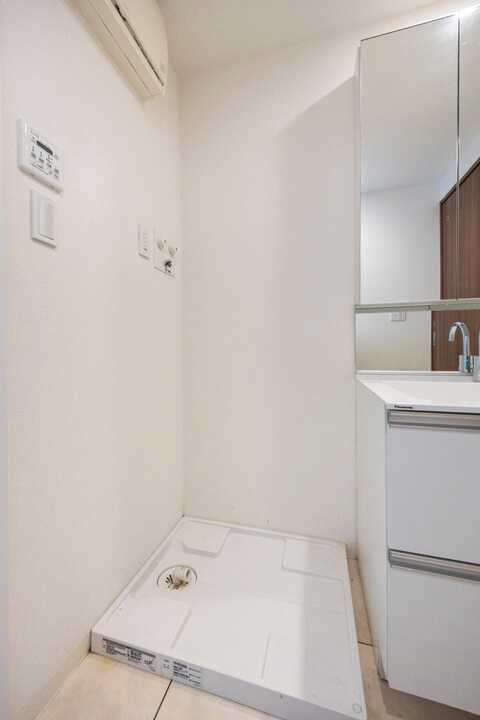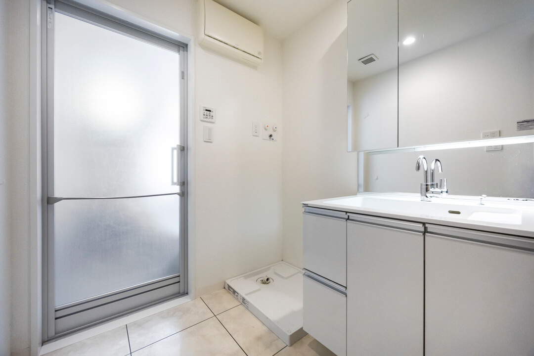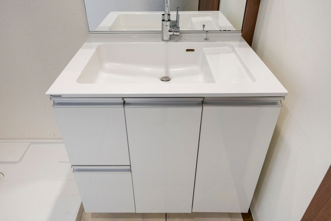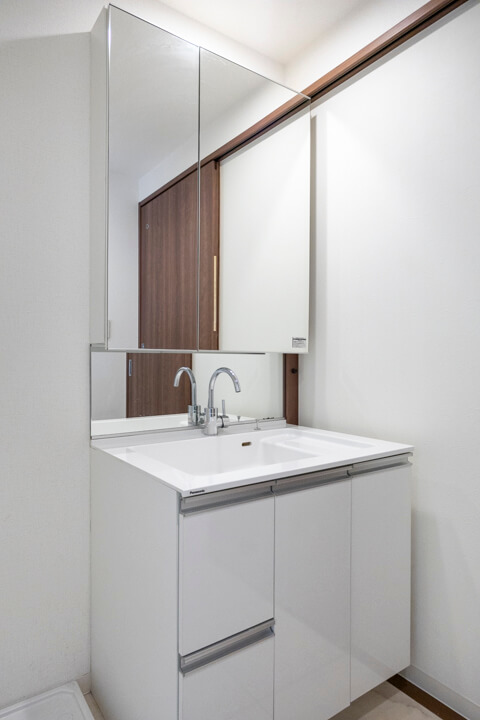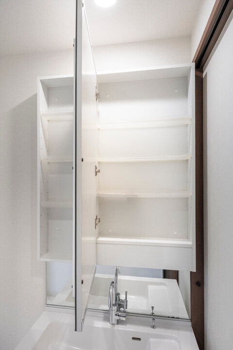 洗面室・浴室・トイレの水回りは2階部にあります。洗面化粧台は洗面まわりの小物がすっきり整頓できるミラーボックス付きです。