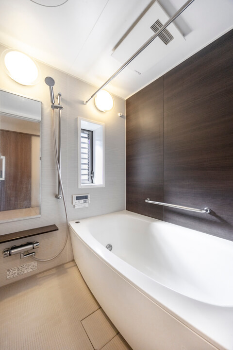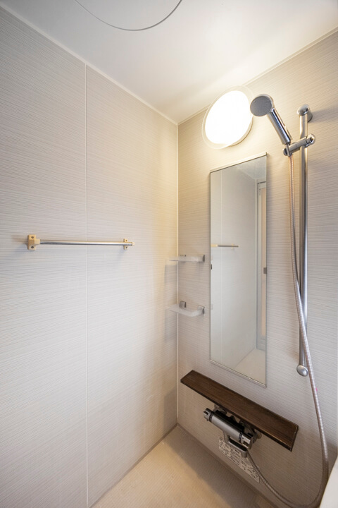 小窓付きでやわらかな光が入るバスルーム。乾燥・換気・暖房・涼風の4つの機能が備わっていて、一年中快適にバスタイムが楽しめます。ランドリーパイプも付いていて雨の日や冬場の洗濯にも困りません。