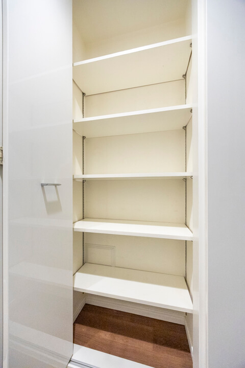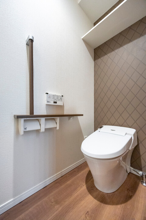 廊下に面したレストルーム。空間がすっきり見えるタンクレストイレです。独立型の手洗い器、ウォシュレット、収納棚も備わっています。