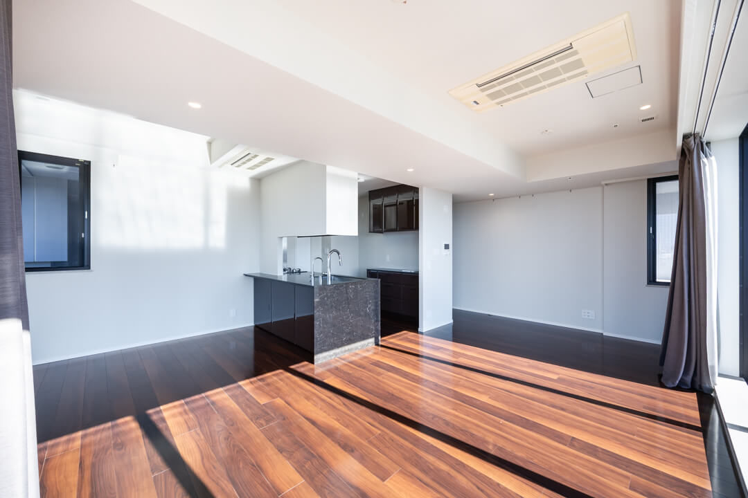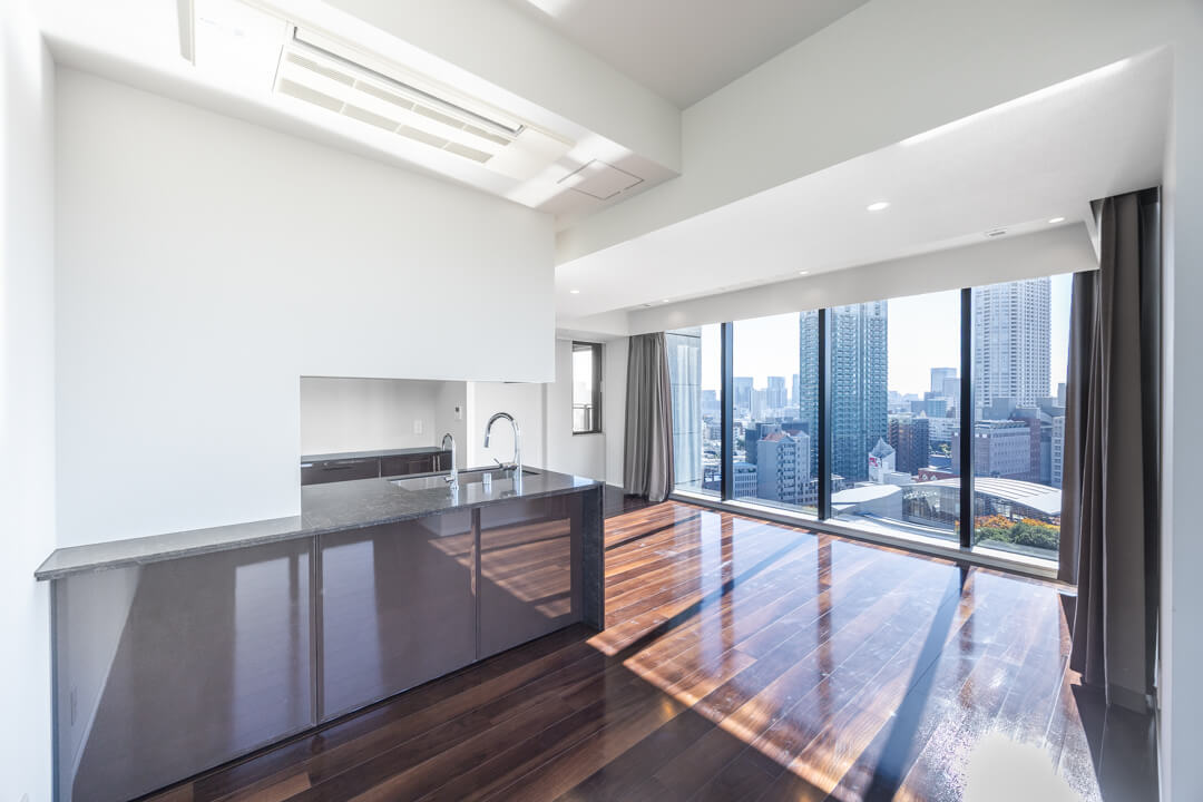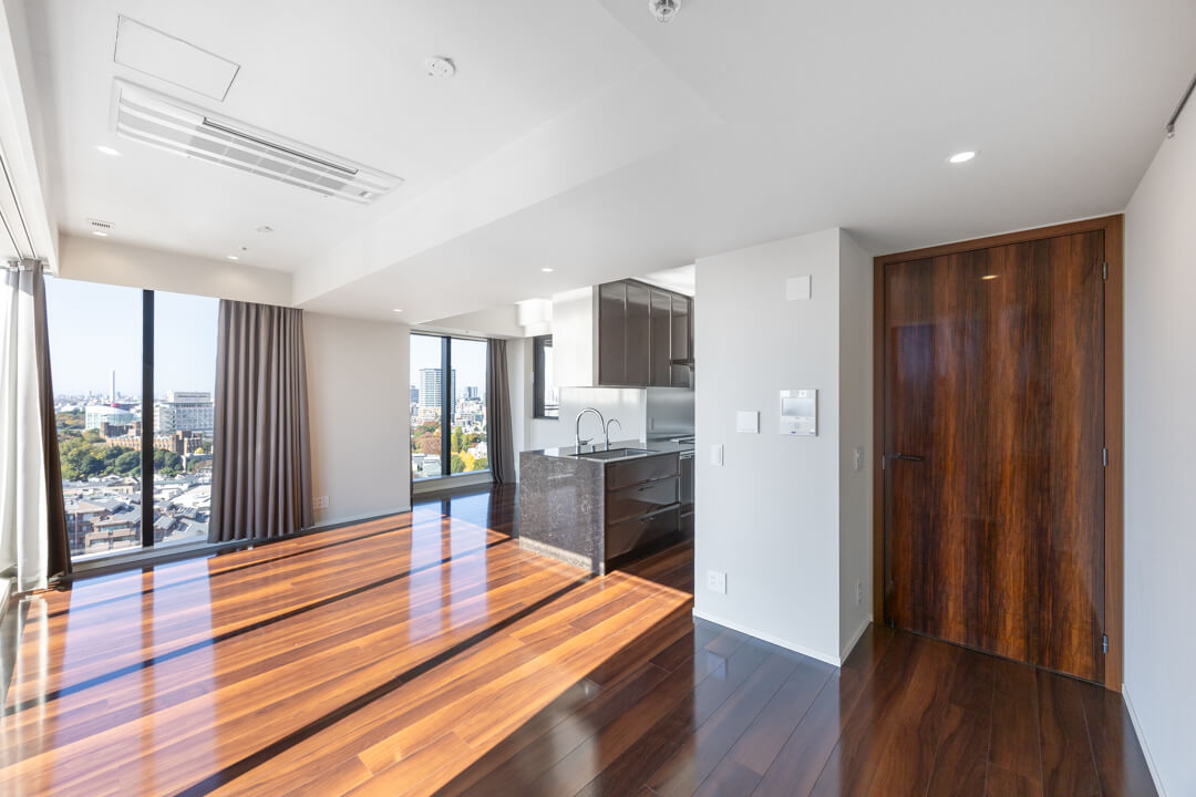 約20.1帖の広々としたLDK。南西2面採光であたたかい太陽光が降り注ぎます。ハイサッシからは八芳園の豊かな緑を望むことができ、開放感たっぷり。折り上げ天井&ビルトインエアコンが奥行きをもたらすのもポイントです。陽の光を浴びて、心地よい時間を過ごせそうですね。