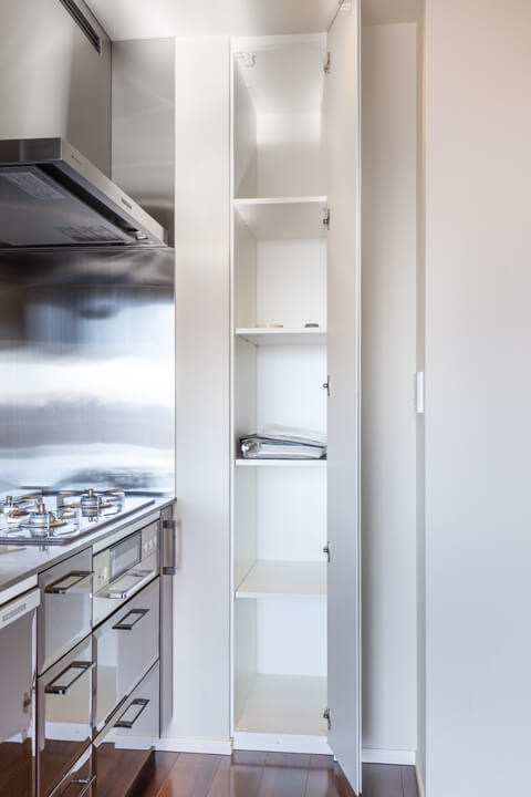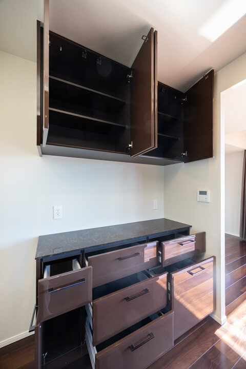 背面には収納力のあるカップボードを完備。キッチンと同じデザインで統一感があります。食料品のストックや食器類を整理整頓でき、ごちゃごちゃしがちなキッチンまわりがすっきり片付きそうです。カウンターにはコンセントが付いていて、キッチン家電の使用に便利です。