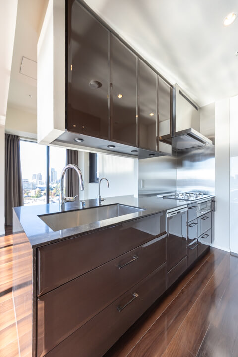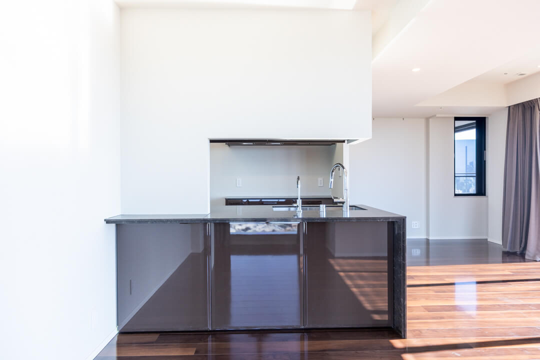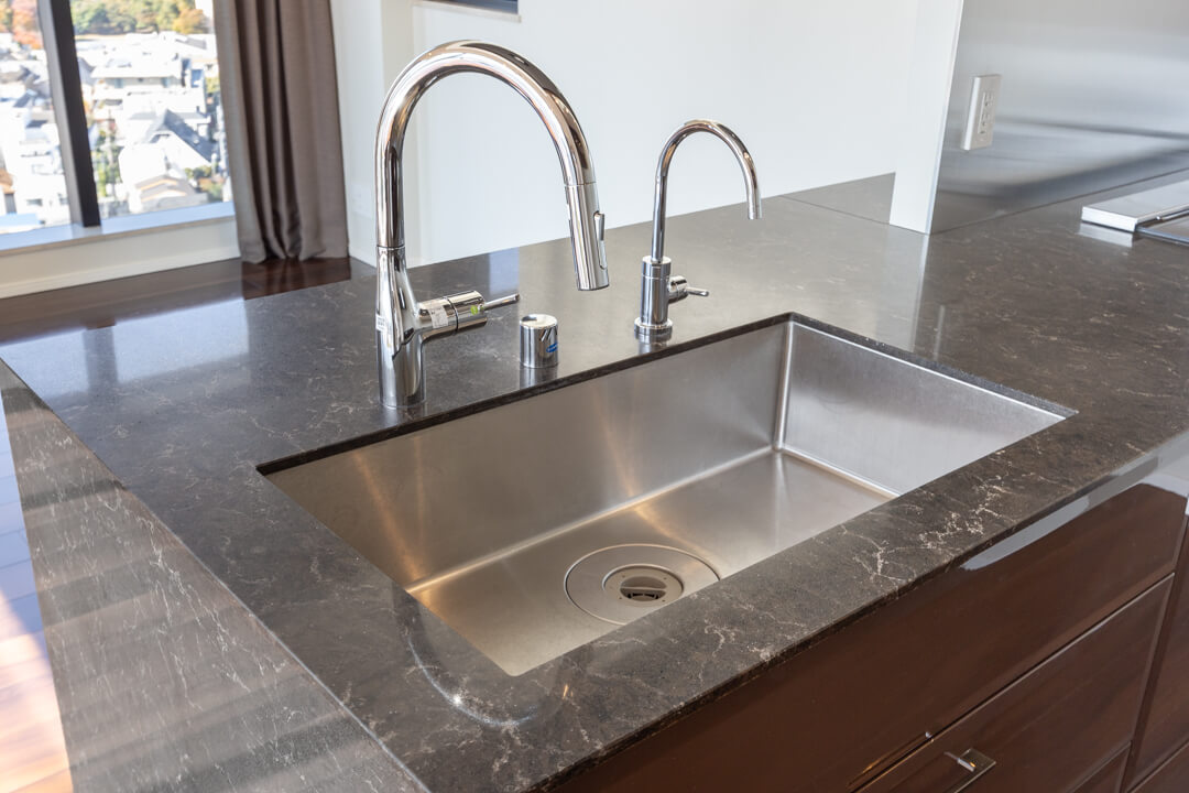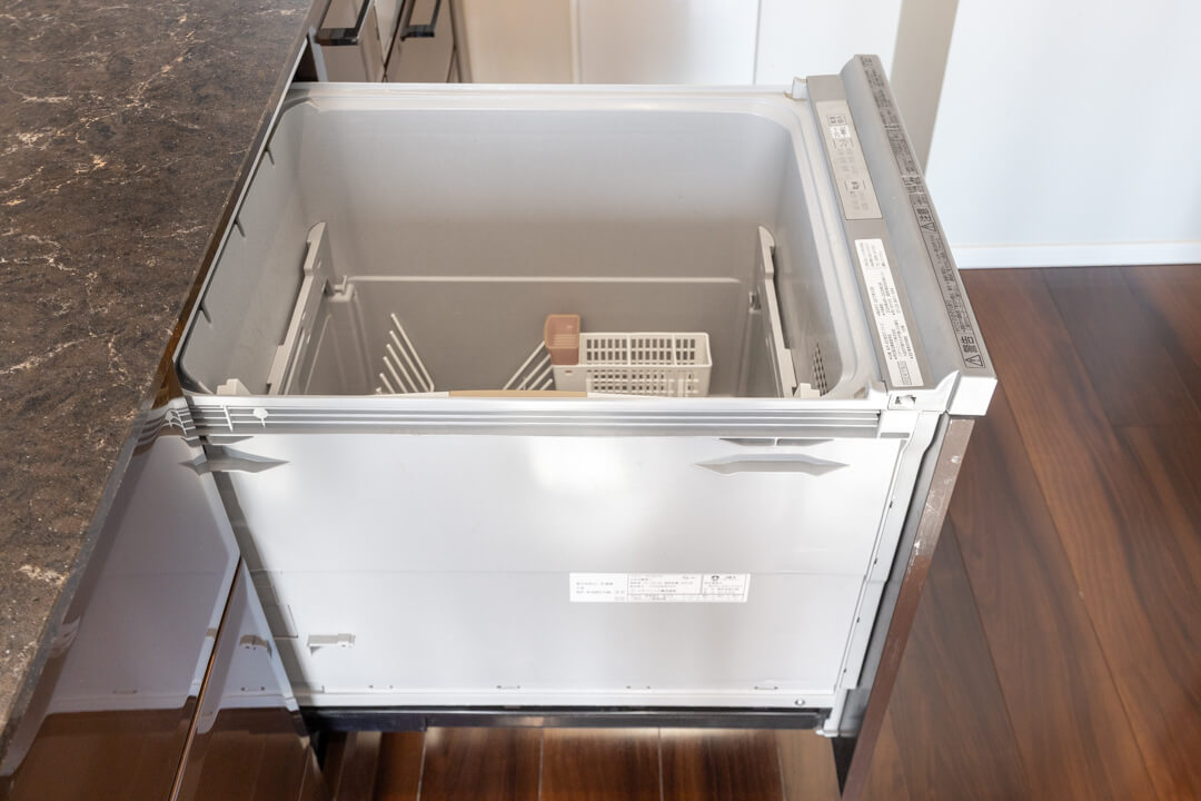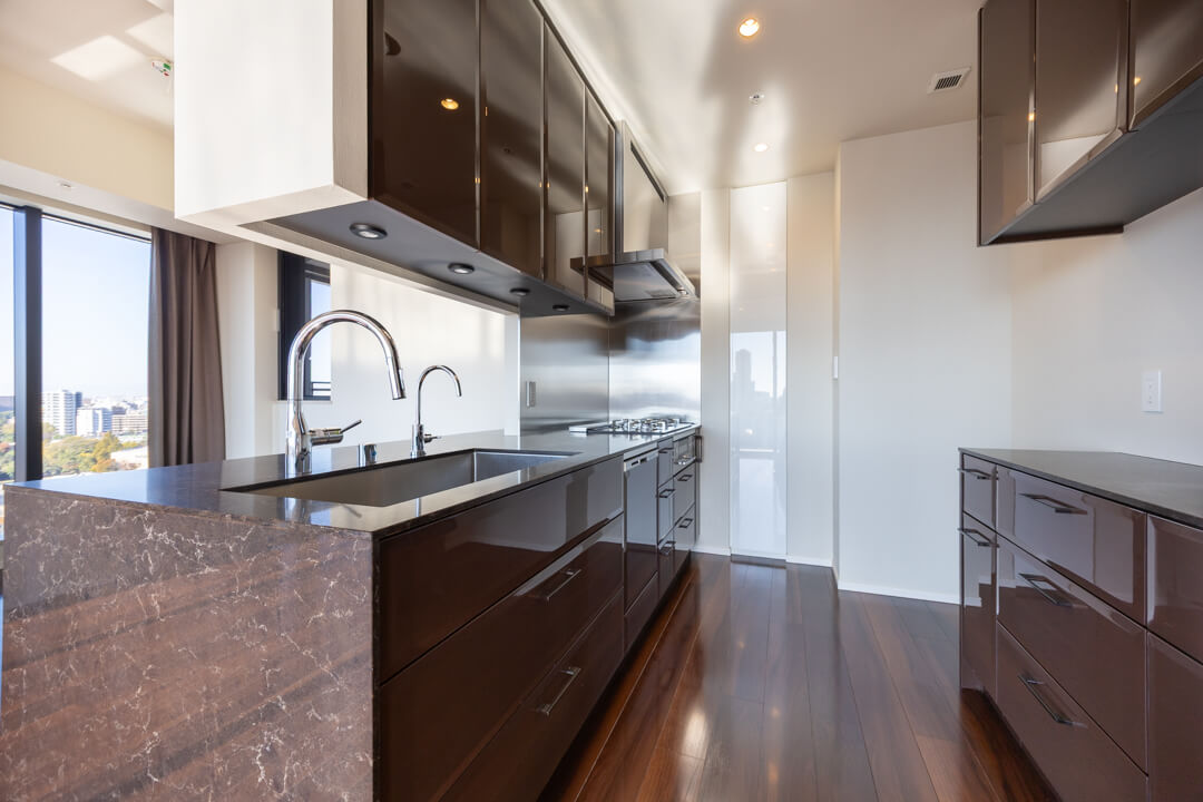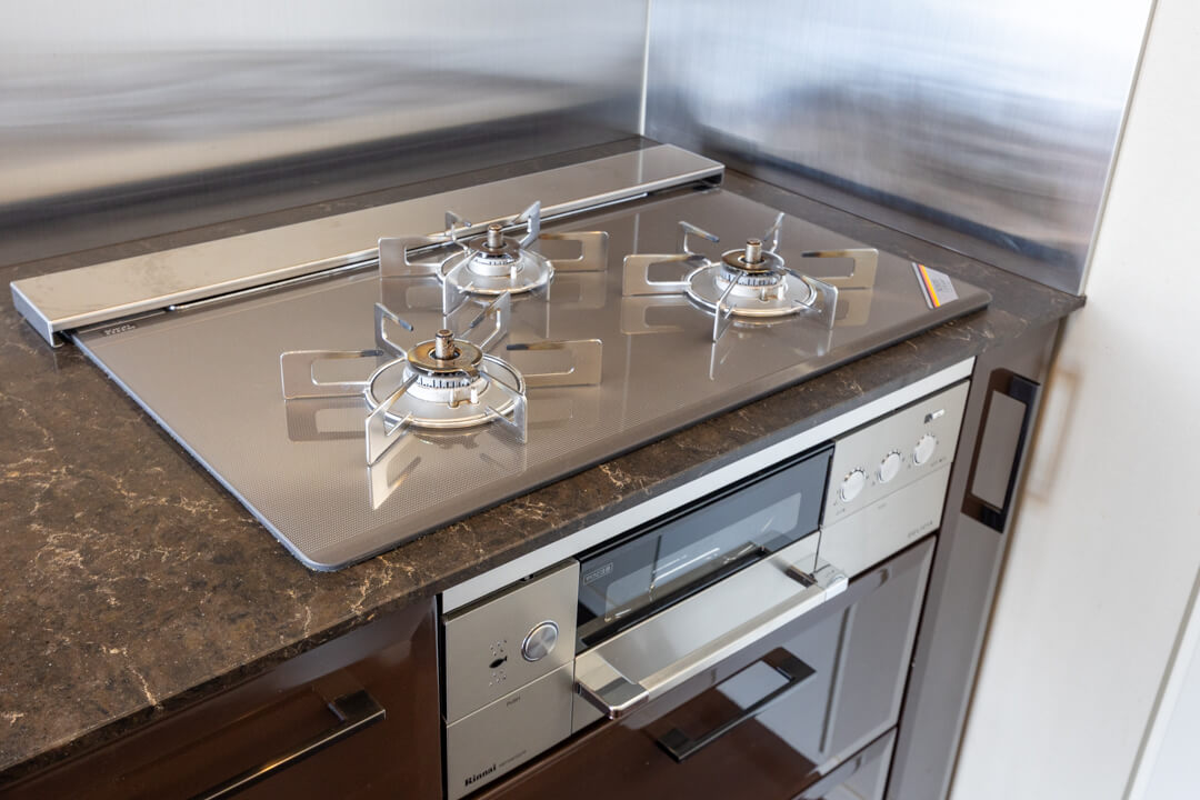 ブラウンの面材&石調カウンターで重厚感の漂うキッチン。シンク側からはリビングダイニングの様子が見えて、会話を楽しみながら作業ができます。グリル付3口ガスコンロ・食洗機内蔵で調理も後片付けも捗りそう。ディスポーザーも搭載されているので、掃除の手間が軽減され、悪臭の原因を防いでくれます。
